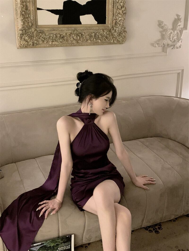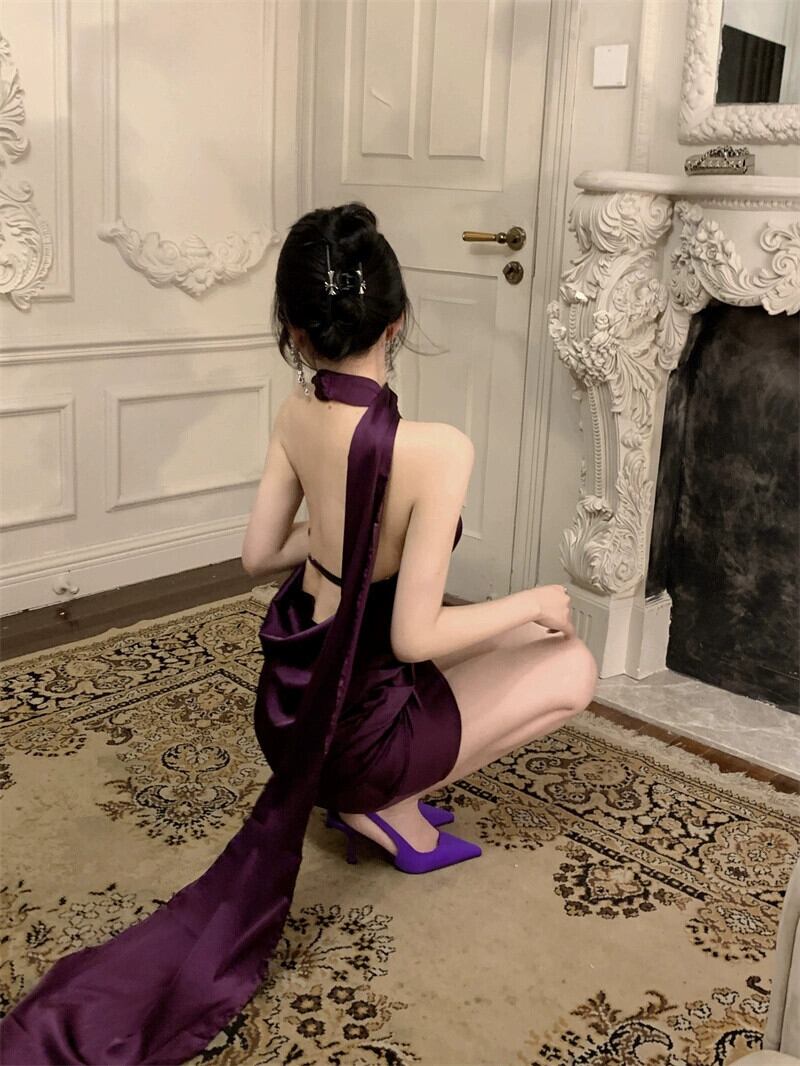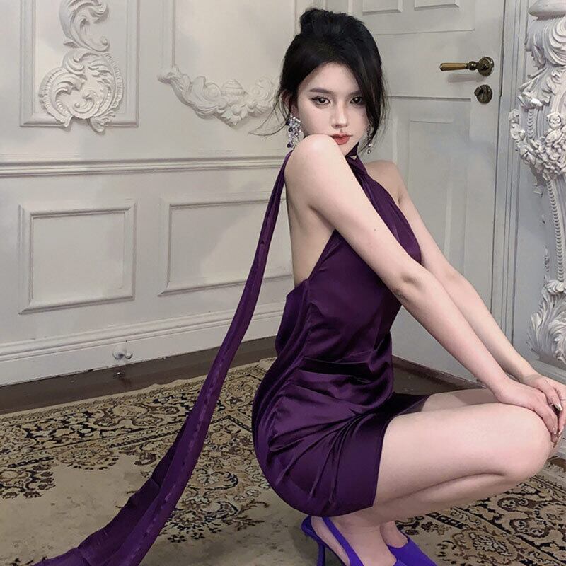 誕生日ドレス女性ハイエンドライト高級小気質ショートパープルセクシーな背中の開いたホルターネックドレス yeyij20844349666