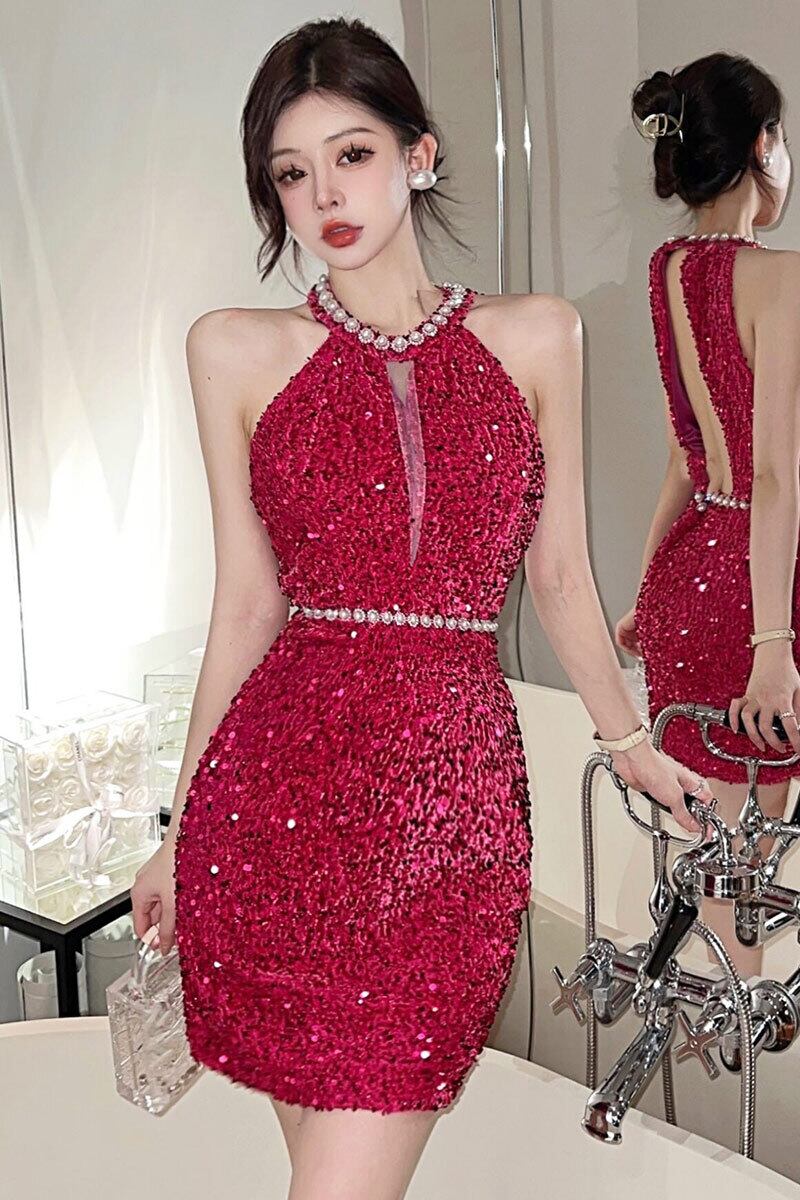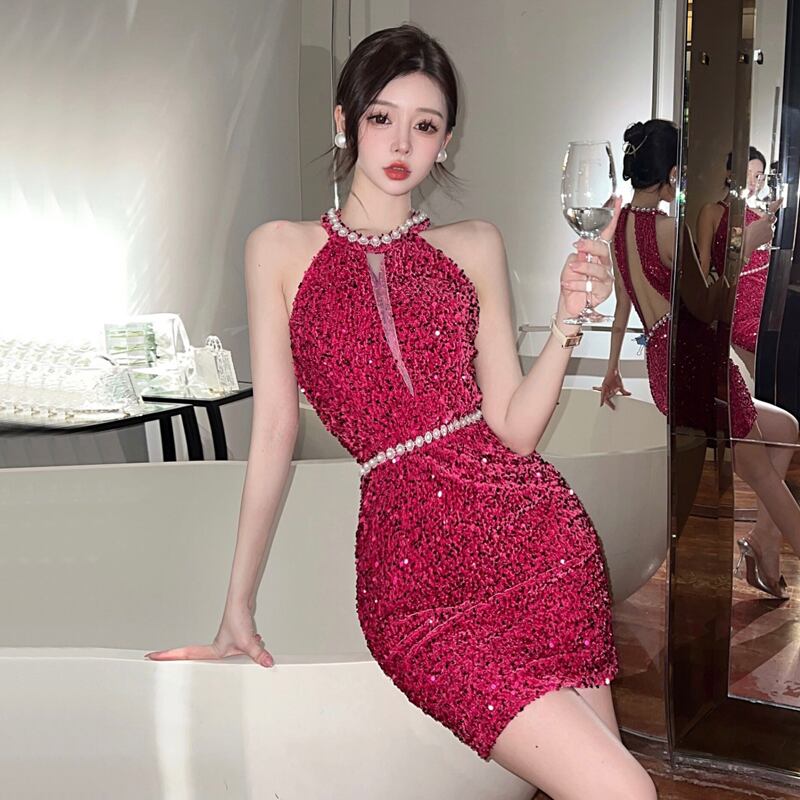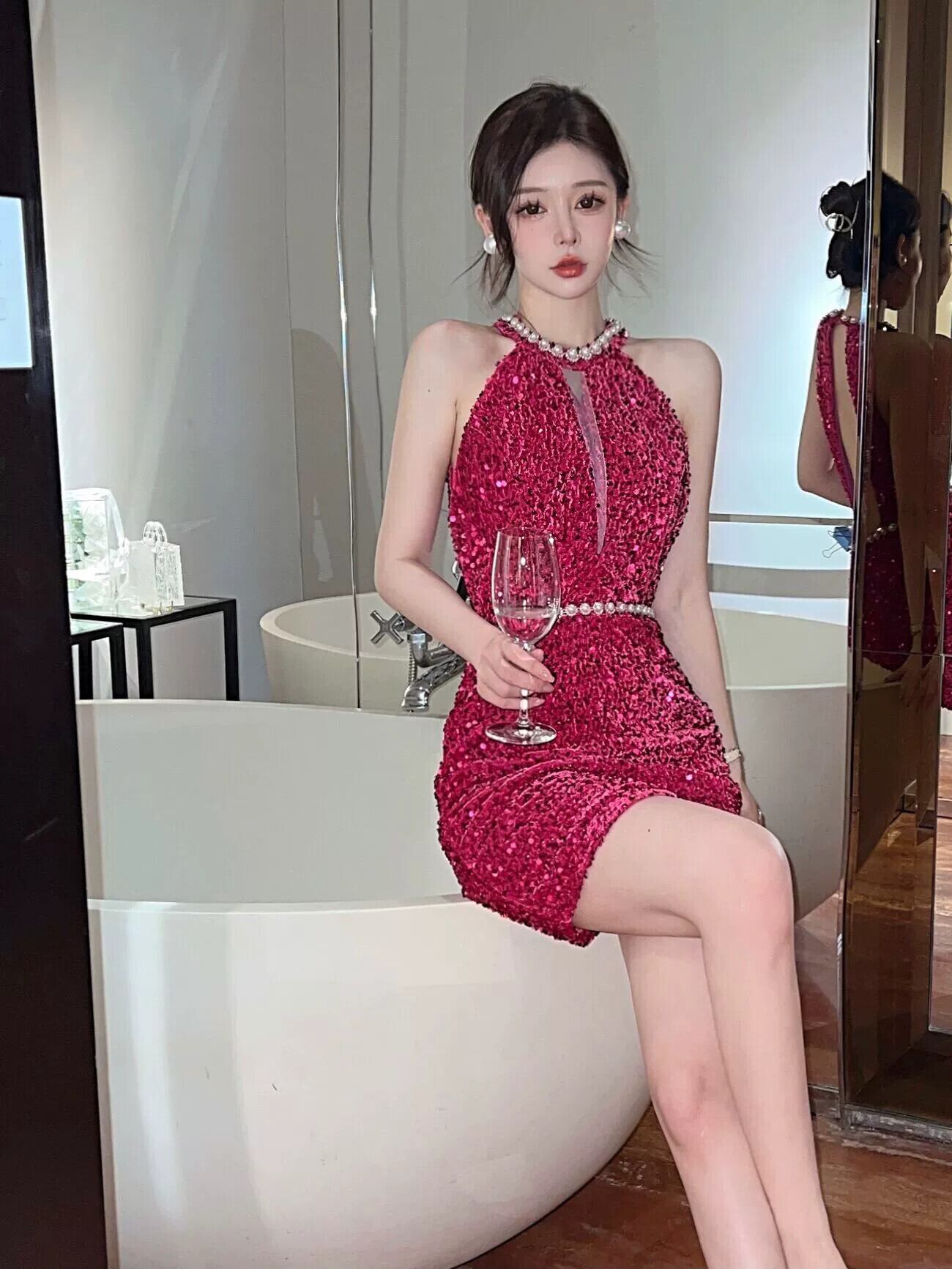 小さなイブニングドレス女性 2023 新しいハイエンド重工業スパンコール宴会気質セクシーな背中の開いたホルターネックドレス yeyij10815186173