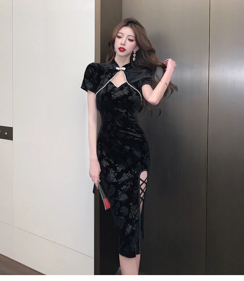 中国風のチャイナドレス新しい2023若いスタイルデイリーブラックベルベットのセクシーな中空スリットミッドレングスドレス yeyij69815152111