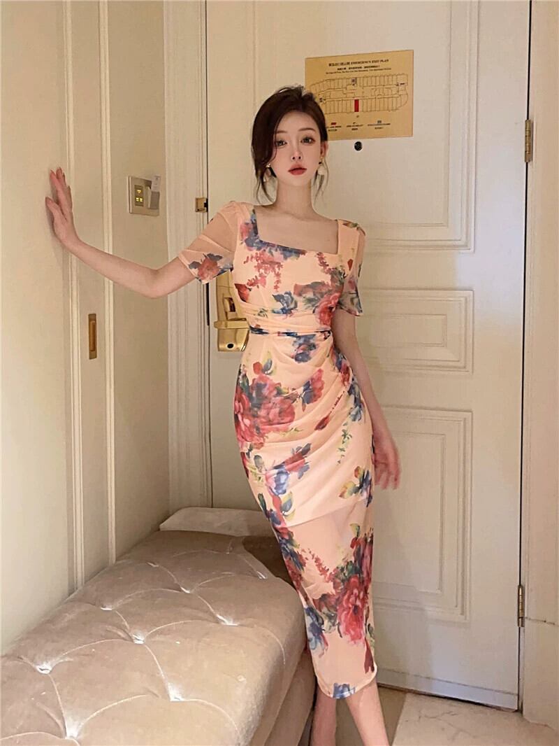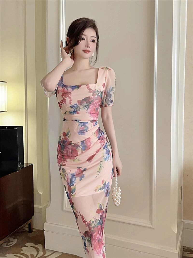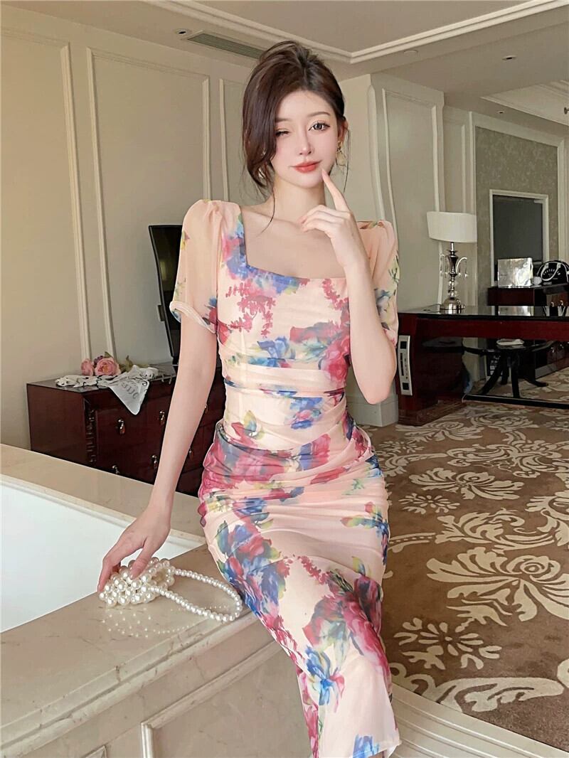 海辺のホリデードレスの女性の夏フレンチレトロスクエアカラー気質スーパーフェアリーメッシュセクシーなスクエアカラーミッドレングスドレス サマー 夏物 スクウェア yeyij56698684633