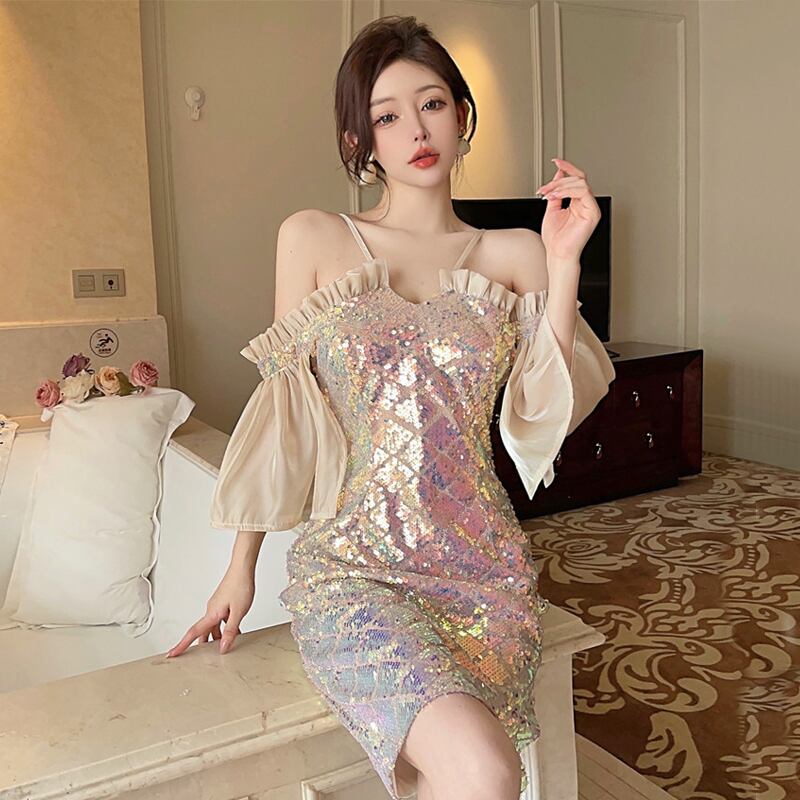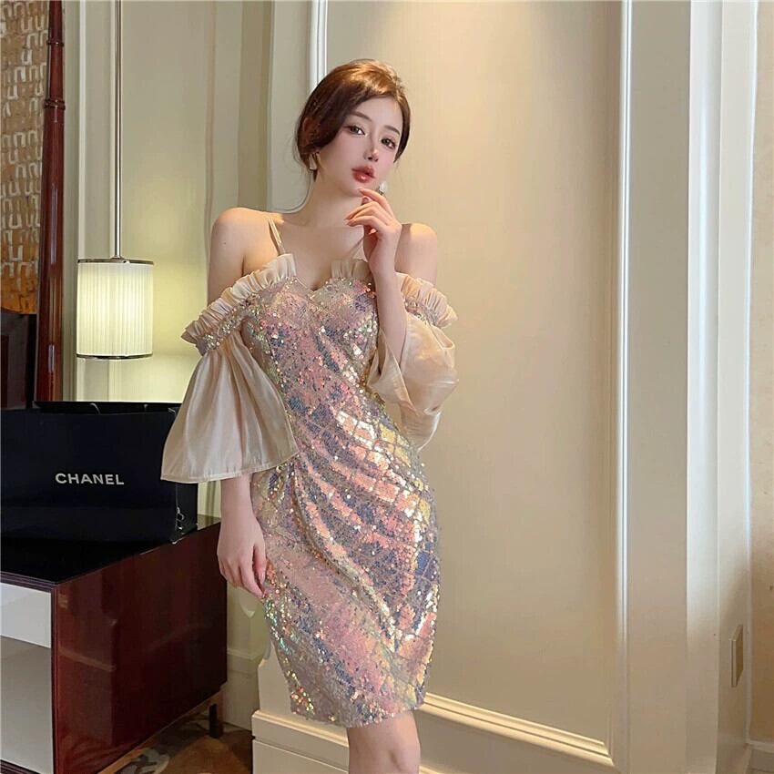 イブニングドレス女性 2023 新しいハイエンド重工業スパンコールフレンチスーパー妖精トランペットスリーブセクシーなサスペンダードレス yeyij77649506187