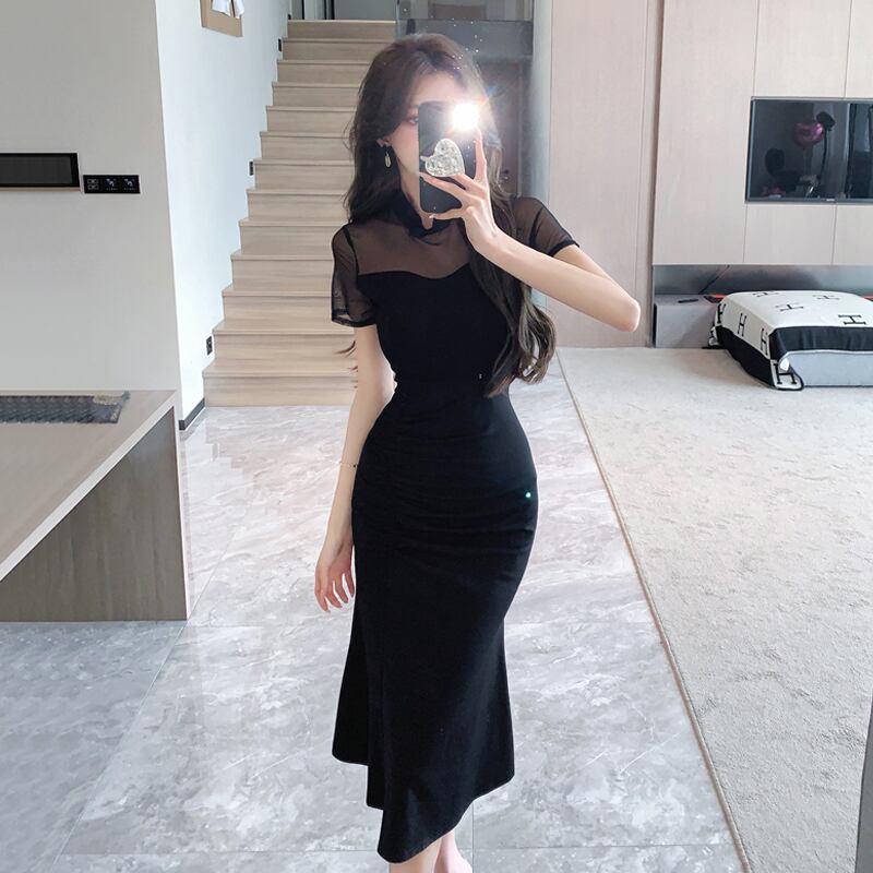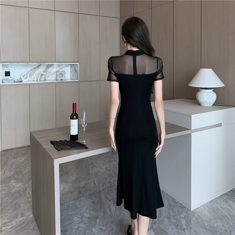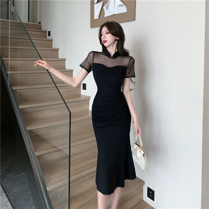 チャイナドレス 2023 新しい若い毎日改良された黒のセクシーなメッシュステッチミッドレングスドレス ブラック yeyij63184948730