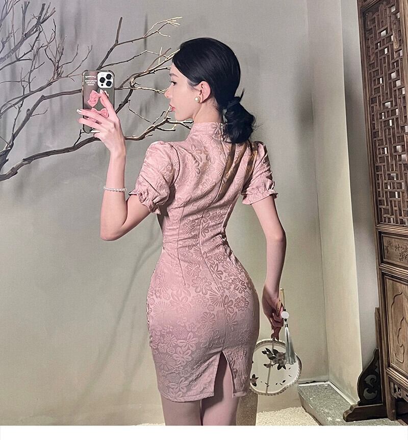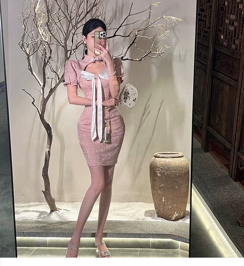 ライブ服アンカー Pogenic 高度な純粋な欲望フレンチスタイルパフスリーブセクシーな中空ヒップパッケージチャイナドレス ピュア yeyij43593091194