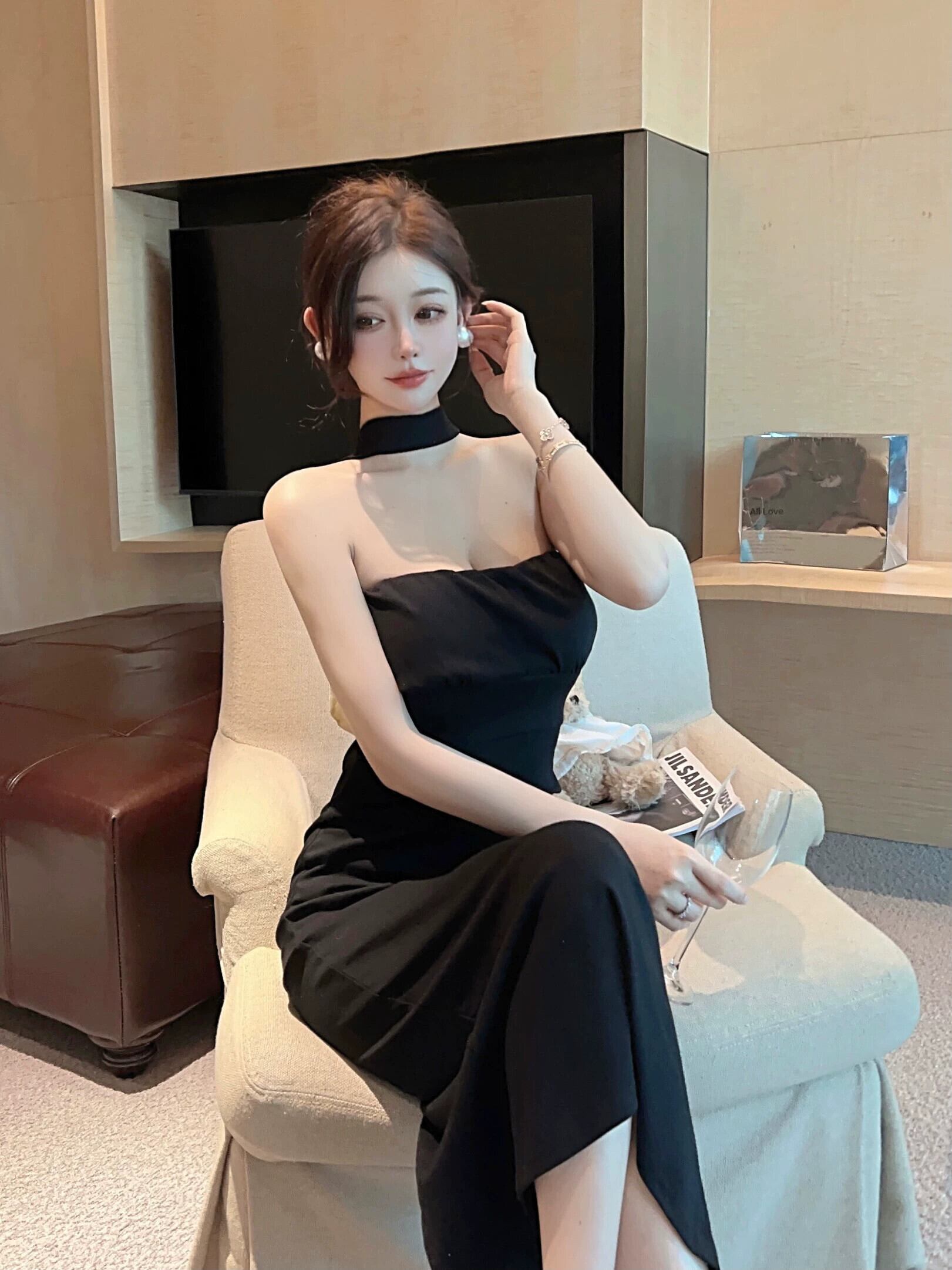 イブニングドレスロングスカートレディースハイエンドフレンチバックリボンブラックセクシーなワンショルダーホルターネックチューブトップドレス yeyij36230988005