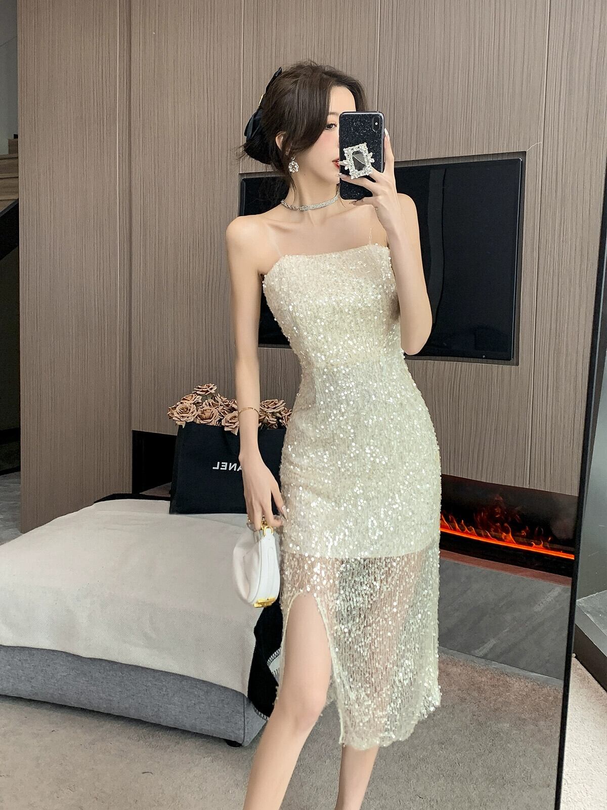 スパンコールイブニングドレスの女性 2023 新しいハイエンド宴会気質セクシーなスプリットミッドレングスサスペンダードレス yeyij71126344618