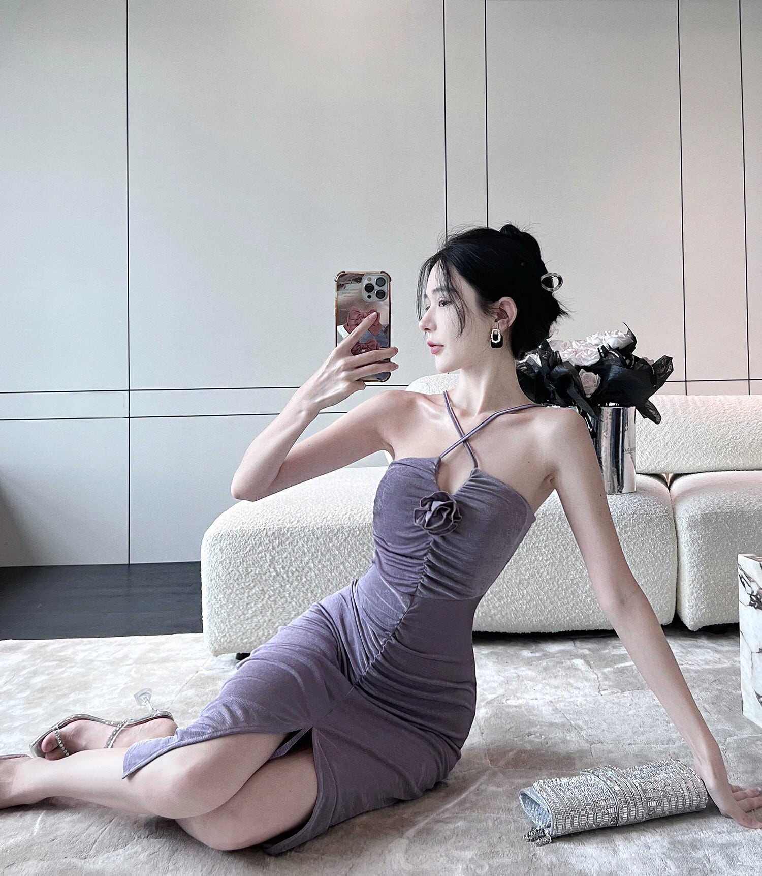 フランス旅行ホリデーロングスカート女性のハイエンド立体花優しい風セクシーなスリムスリムサスペンダードレス フラワーデザイン yeyij72473082409