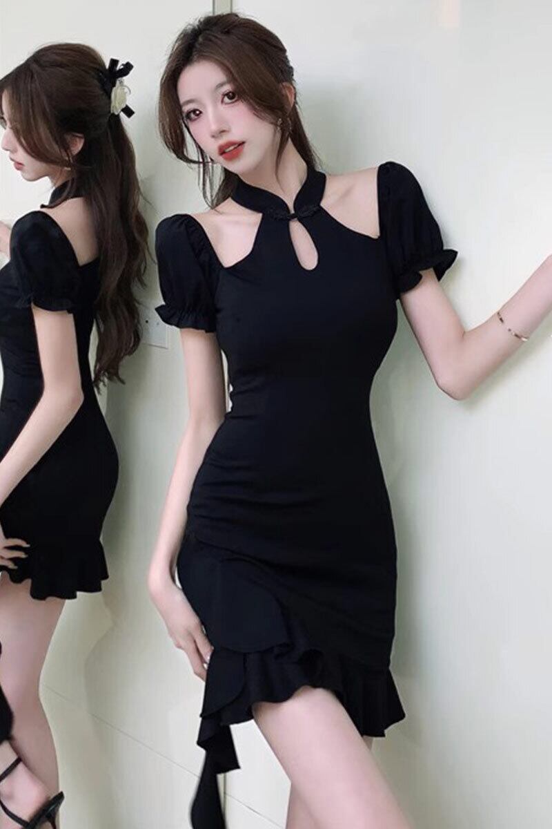 ライブ服女性アンカー pogenic 若い黒パフ スリーブ セクシーなストラップレス ホルターネック チャイナ ドレス ブラック yeyij75382030861