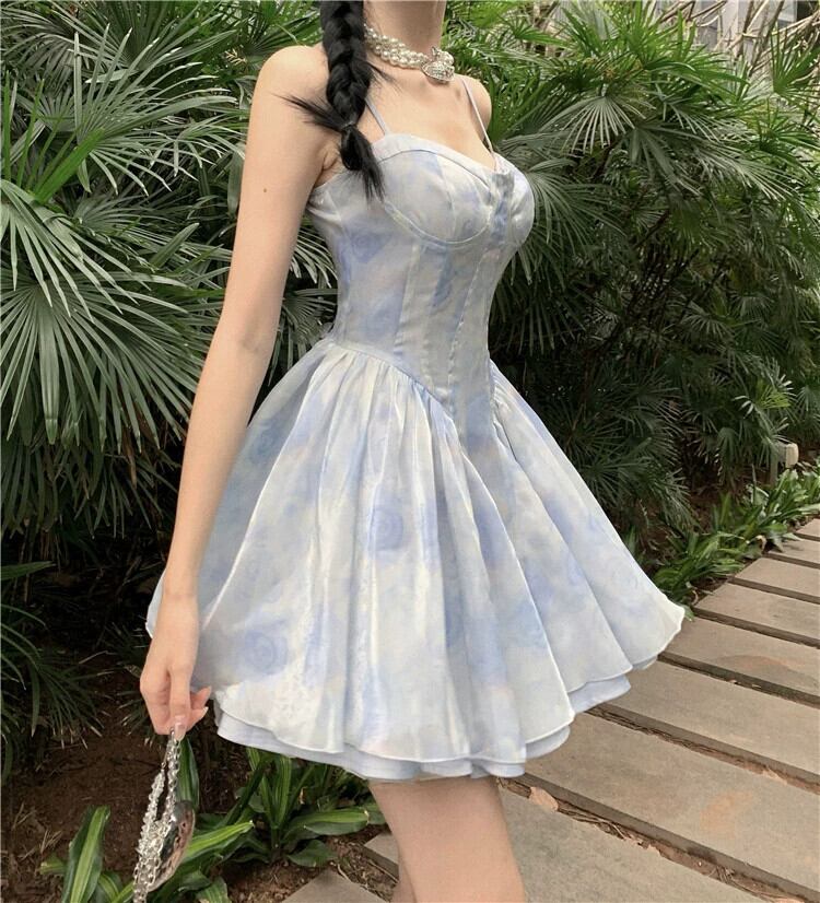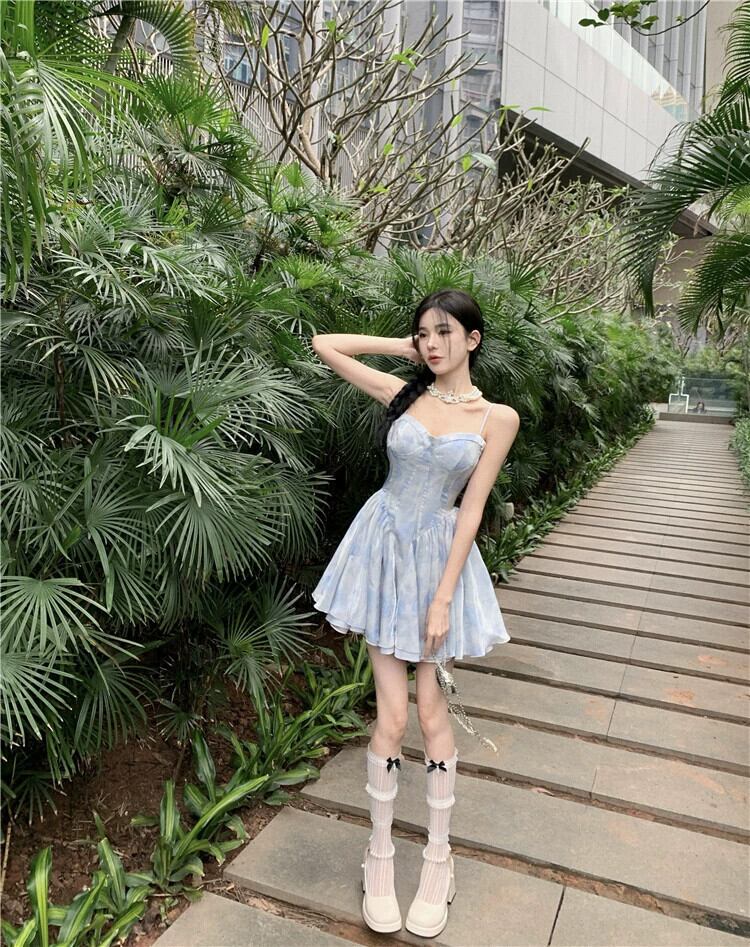 旅行ホリデードレスの女性のハイエンド感覚スーパーフェアリーフレンチセクシーなウエスト痩身ショートふわふわサスペンダードレス yeyij92048182107
