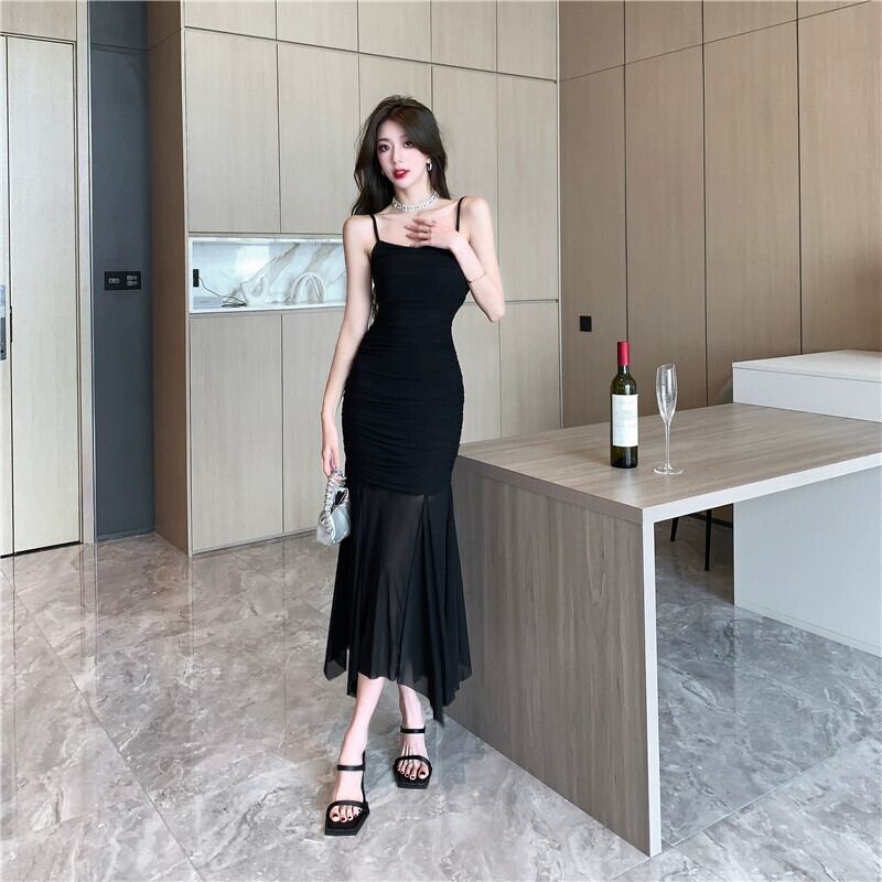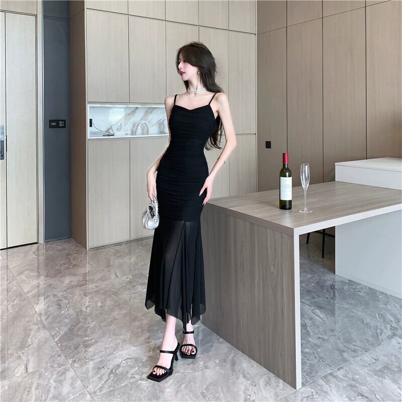 黒のイブニングドレスロングスカート女性 2023 新しいハイエンド気質セクシーな見事なフィッシュテールサスペンダードレス ブラック yeyij56324573749
