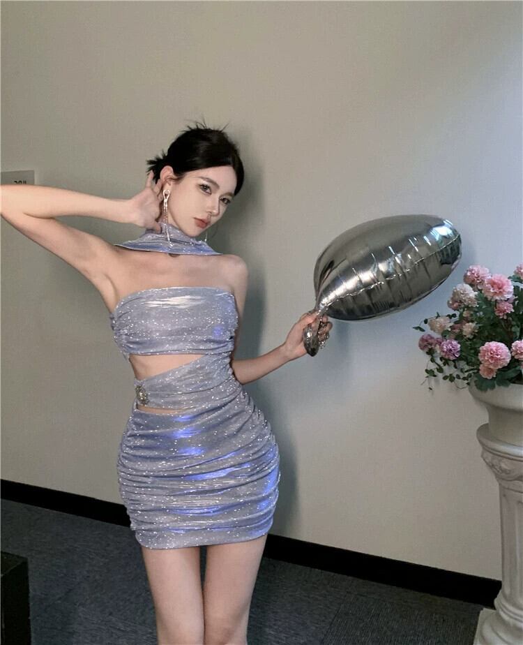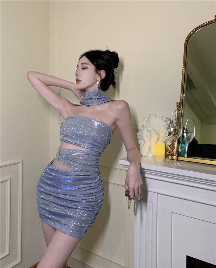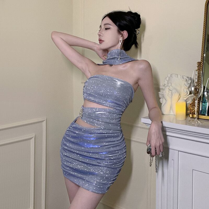 宴会気質小さなドレスショート光沢のあるシルクイブニング女性のセクシーな斜め襟ワンショルダーホルターネックチューブトップドレス yeyij34587134573