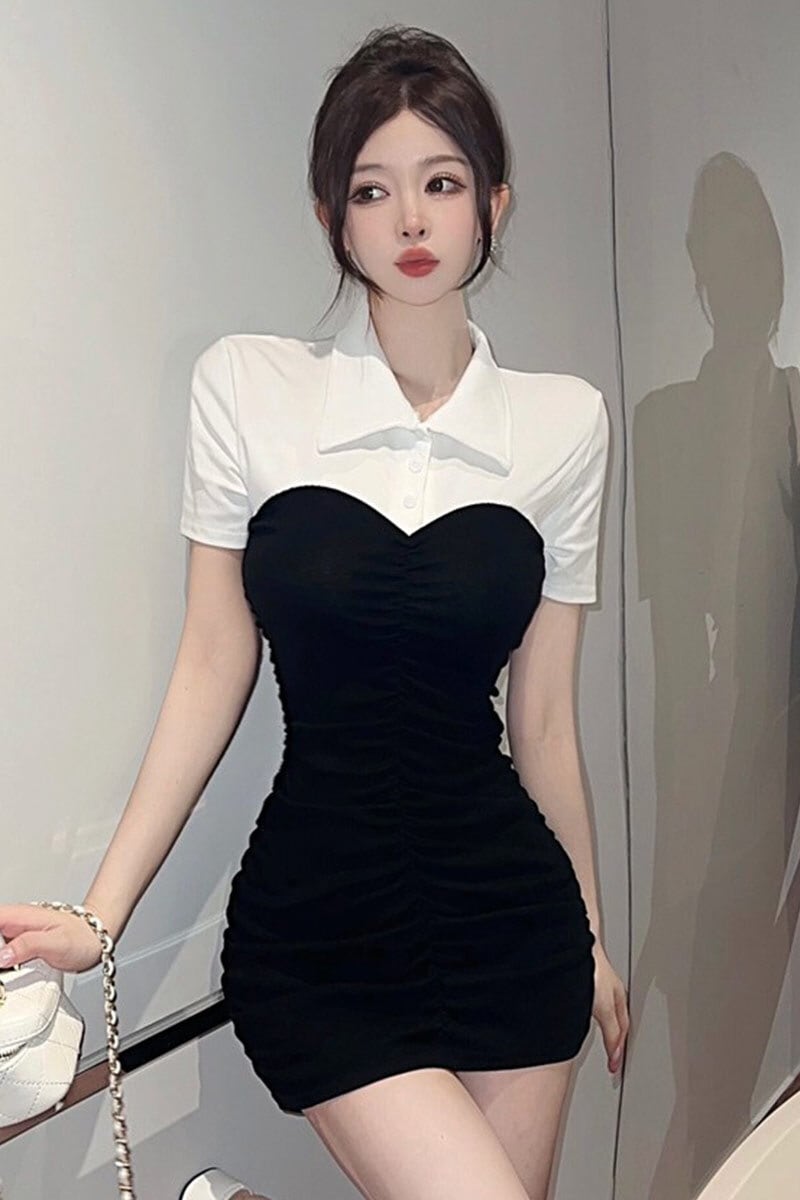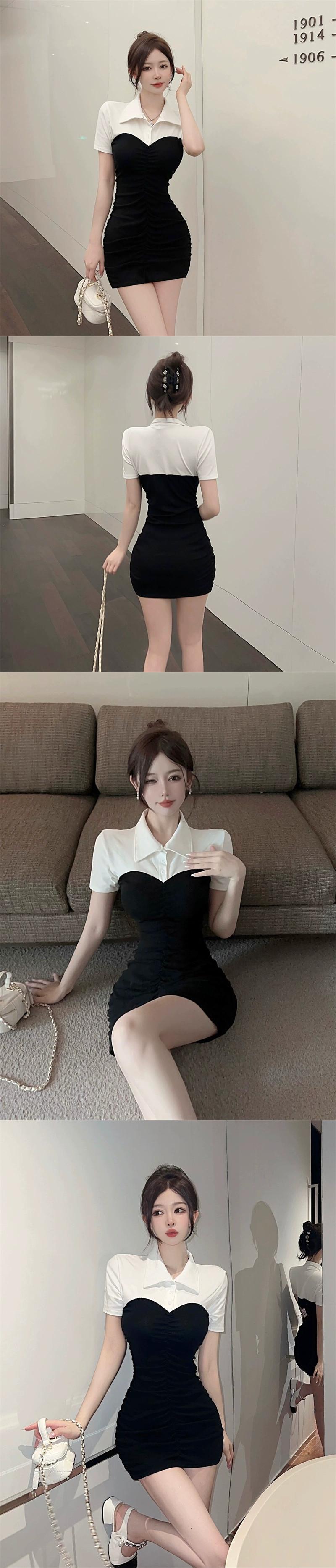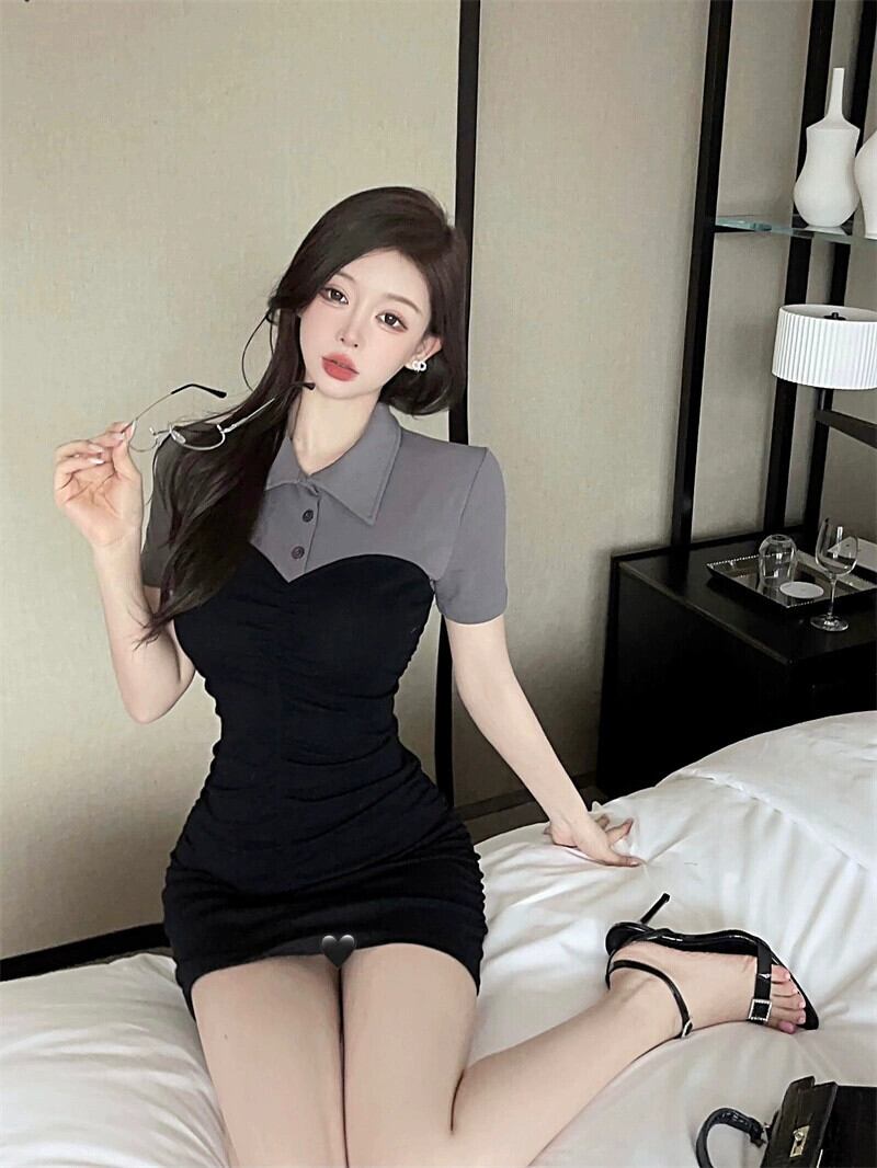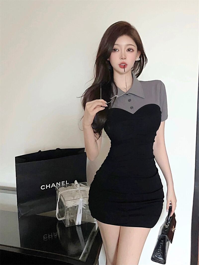 夏の婦人服 2023 新しいスタイル軽くて成熟したロイヤルシスタースタイルのヒットカラーポロカラータイトヒップ半袖ミッドレングスドレス ショート ハーフスリーブ サマー 夏物 yeyij77587728483