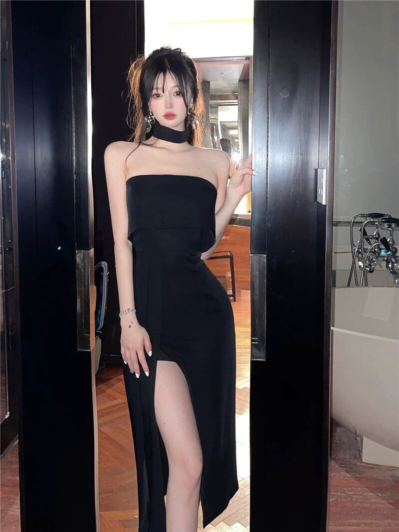 黒のイブニングドレス女性 2023 新しいハイエンド気質ロングスカートセクシーなスリットワンショルダーチューブトップドレス ブラック yeyij72158715732