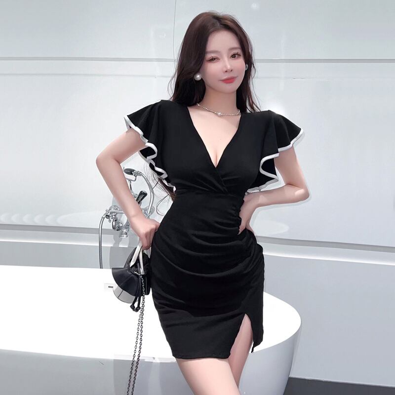 ナイトクラブの女性の夜の作業服技術者中国風のセクシーなローカット深い V ネック蓮の葉の袖ヒップドレス Vネック yeyij54534679465