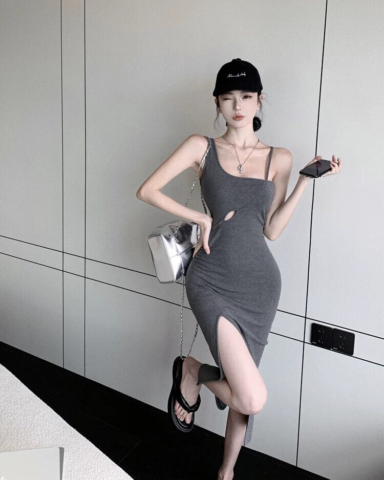 旅行ホリデードレスの女性の夏の高級感セクシーな中空スリットスリムスリム斜め襟ワンショルダーサスペンダードレス サマー 夏物 yeyij2781450587