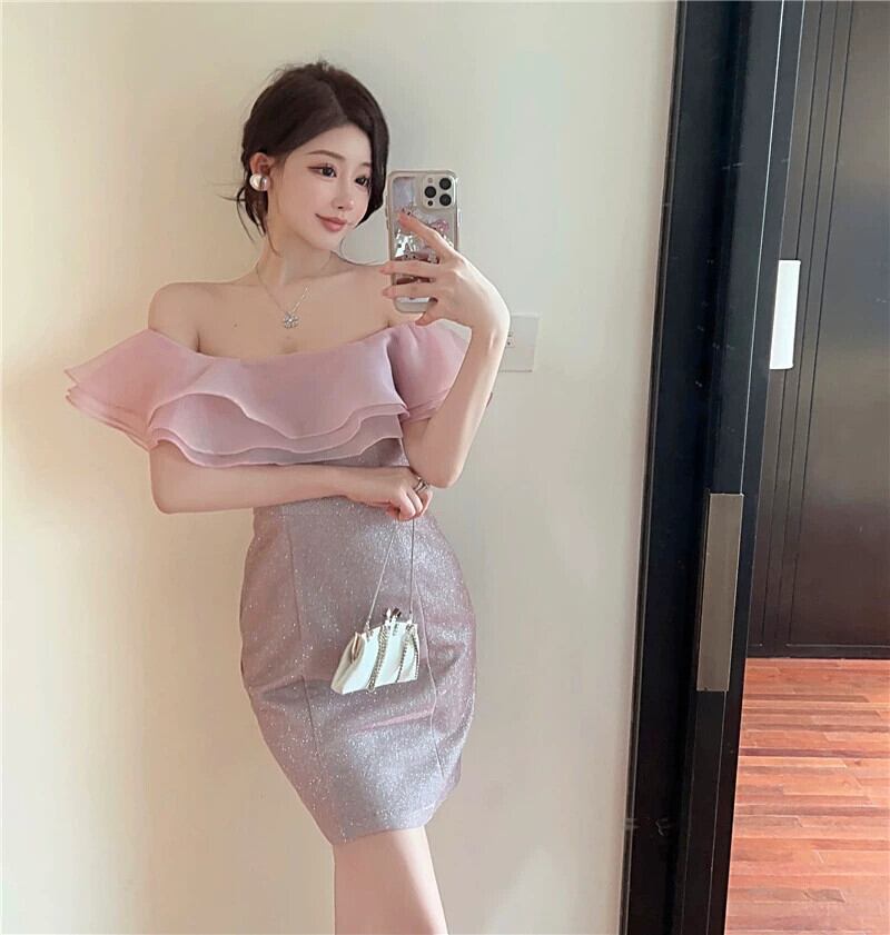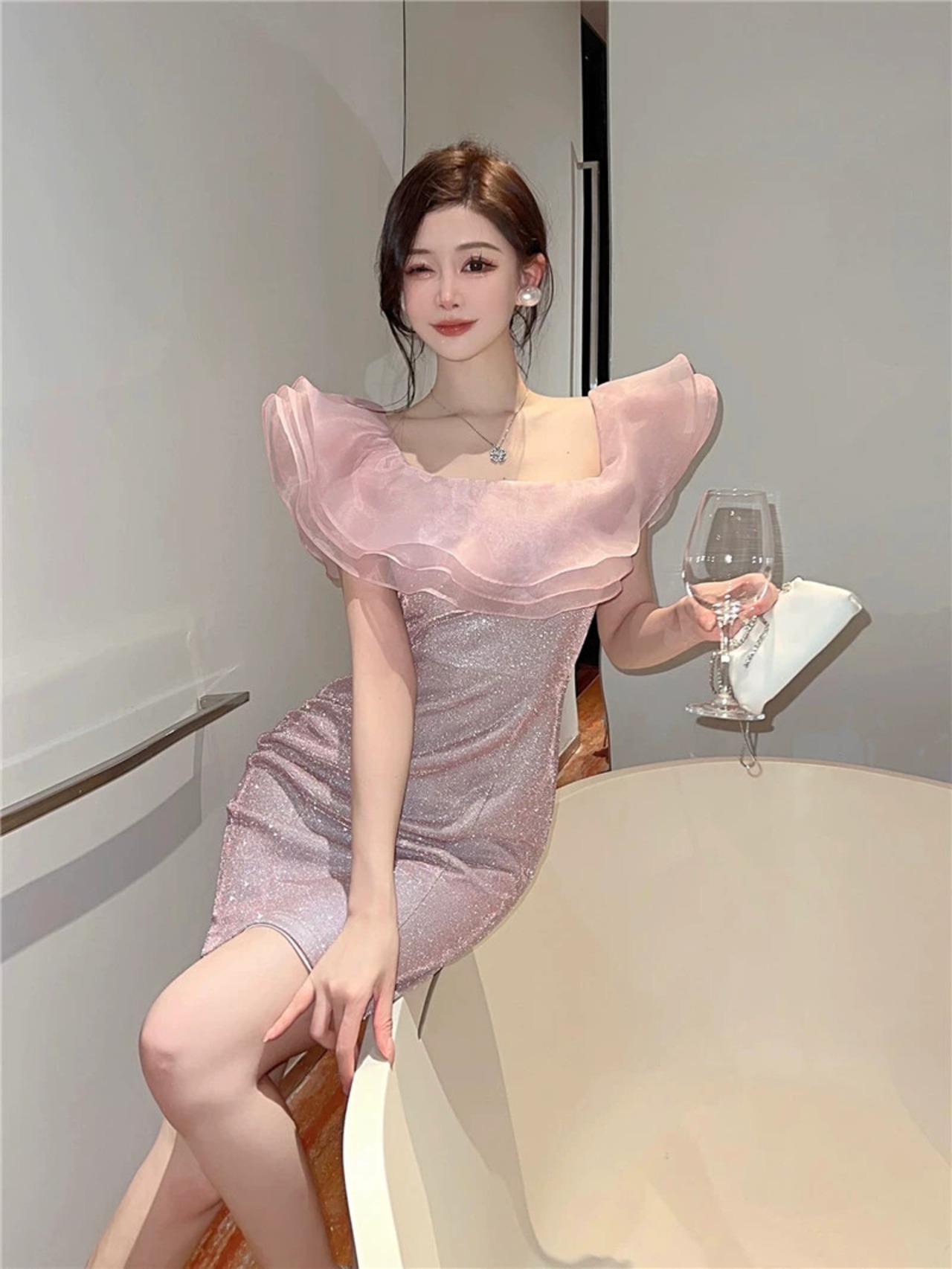 ピンクの誕生日ドレスの女性の高級感フレンチスーパーフェアリー光沢のあるシルクフリルセクシーなワンショルダードレス yeyij59505677644