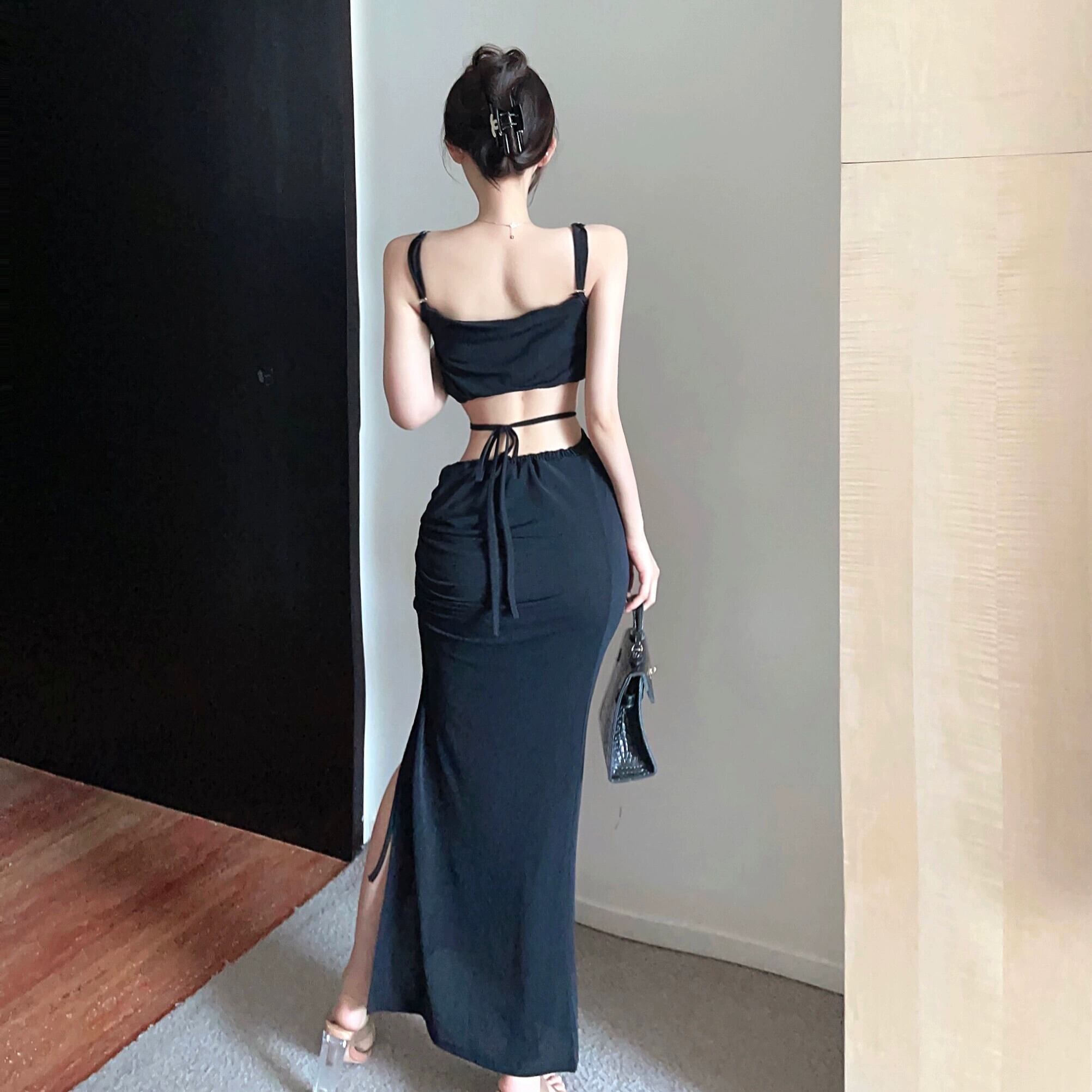 フレンチブラックセクシーな女の子中空アウトウエストサスペンダードレス2023新しい夏の休日スタイルのロングスカート サマー 夏物 yeyij3373036644