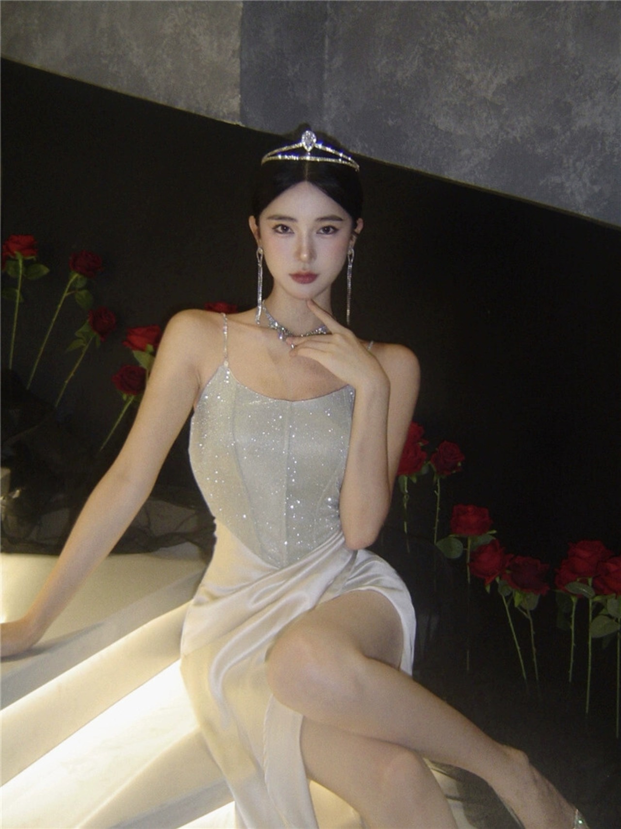 イブニングドレスの女性のハイエンドハイエンドロングスカートライト高級ニッチ光沢のあるシルク宴会気質ロングサスペンダードレス yeyij70348563914