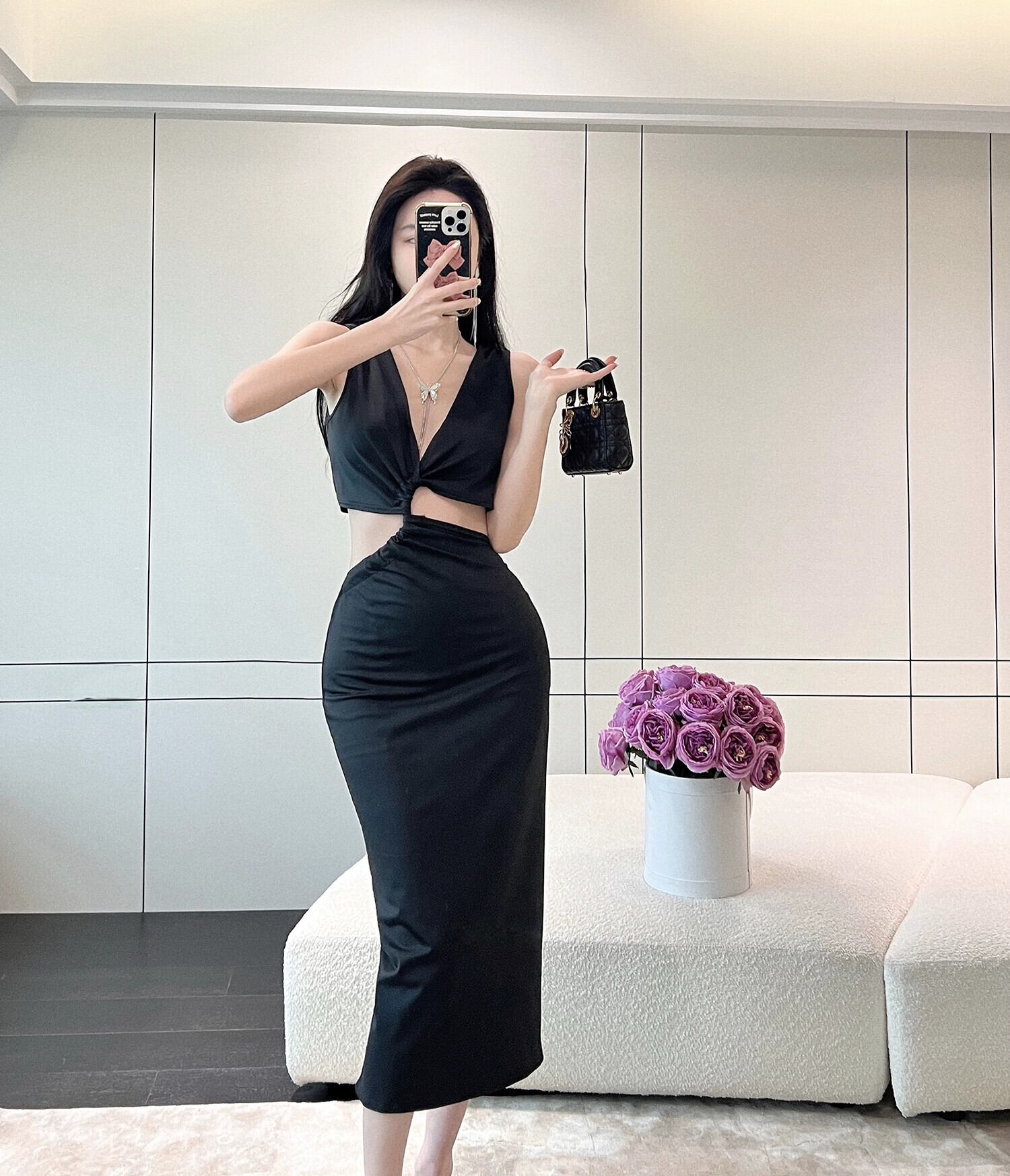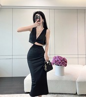 イブニングドレスの女性のハイエンド感覚新しい夏のビッグ V ネック中空ウエストセクシーな休暇海辺タイ黒ジャンプスーツ ブラック サマー 夏物 Vネック yeyij68932351407