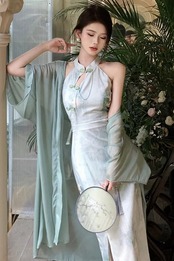 中国風の国民風のセクシーなストラップレスのミッドレングス首吊り改善されたチャイナドレスの女性の夏の日焼け止めカーディガン サマー 夏物 yeyij14757636438