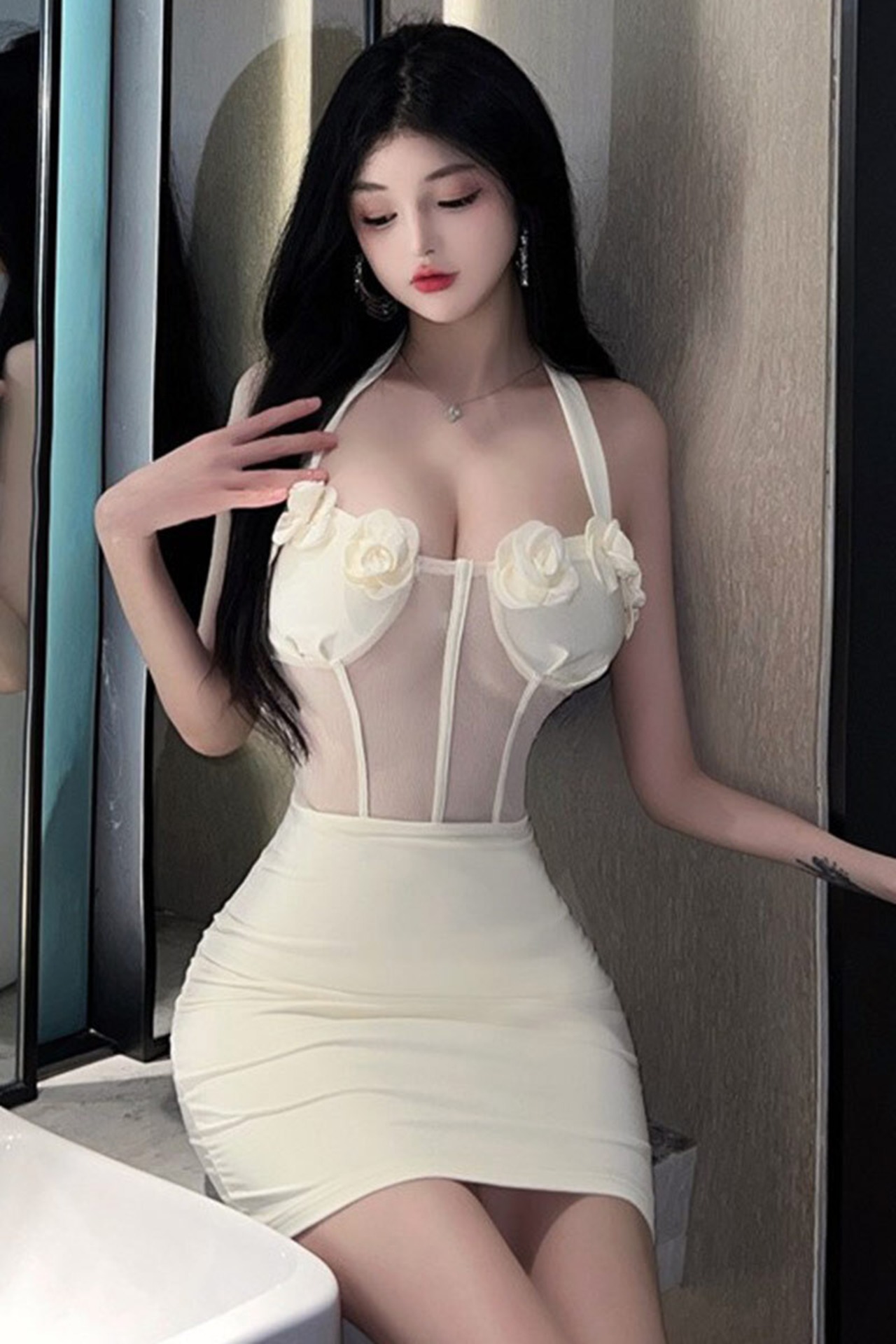 夜の現場作業作業服ペディキュア女性技術者の服セクシーな女性のメッシュステッチホルターネックストラップドレス yeyij57201768107