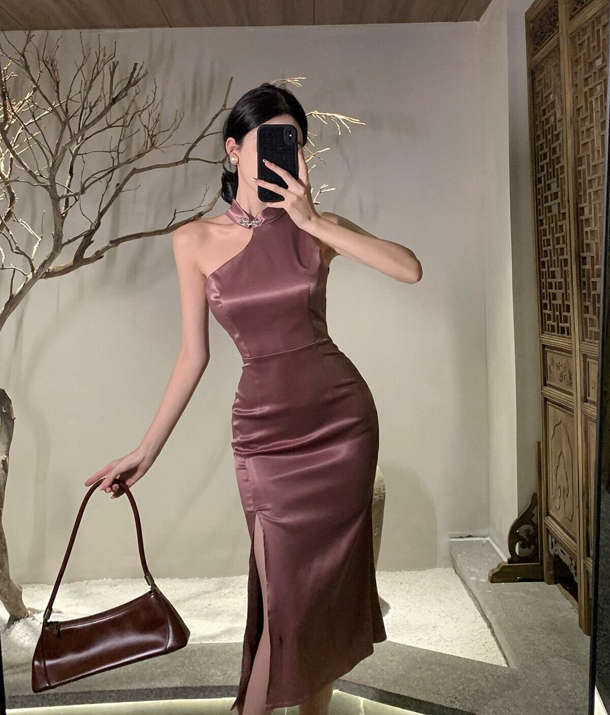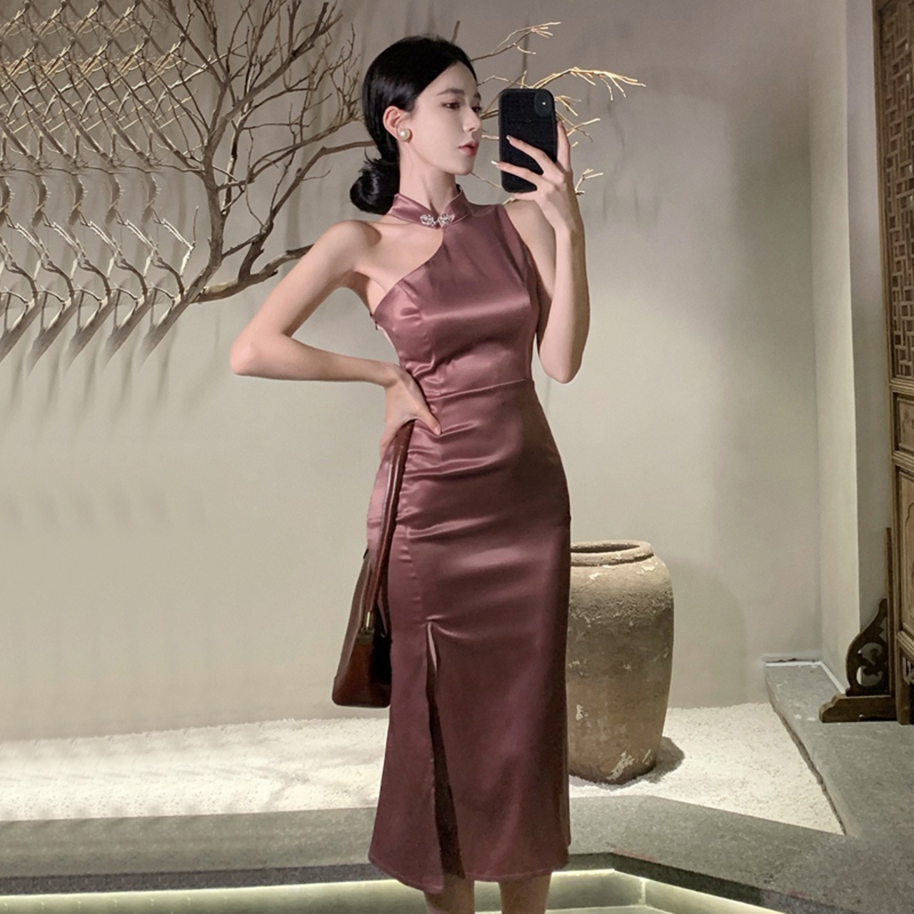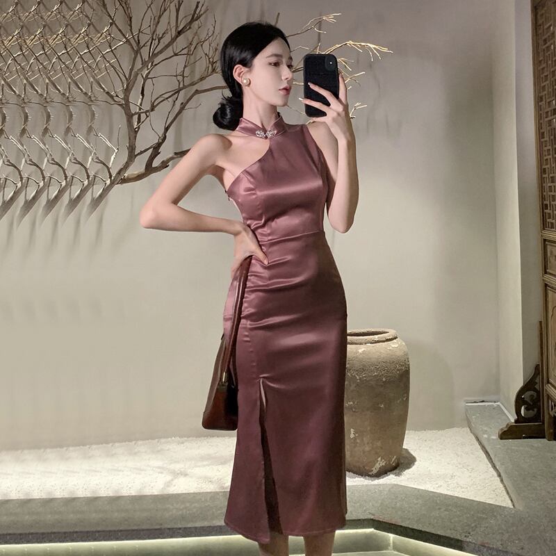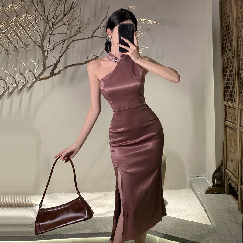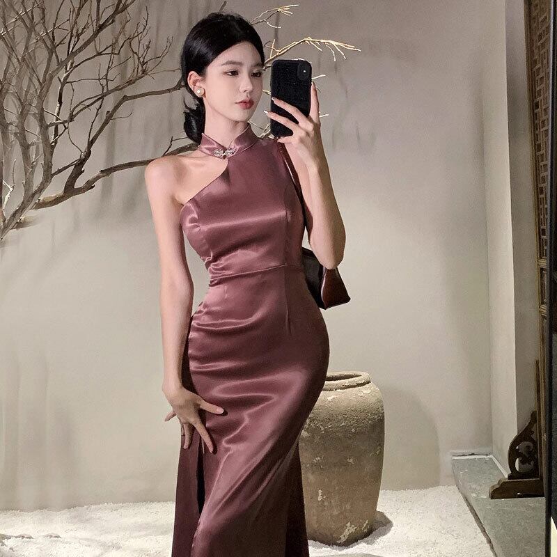 イブニングドレスの女性 2023 新しいハイエンドサテンレトロ中国風のセクシーなストラップレスホルターネックチャイナドレス yeyij98662235581