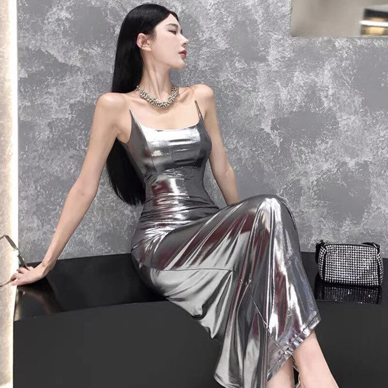 イブニングドレスロングスカート女性 2023 新しいハイエンドセンス光沢のある光沢のある気質自己修養見事なセクシーなサスペンダードレス yeyij38158580259