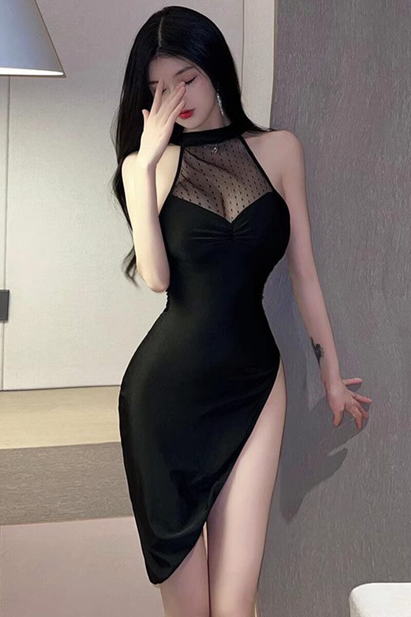 夜間作業作業服フットセラピー女性技術者服セクシーな女性のメッシュステッチハイスリット吊りネックドレス yeyij85277780221