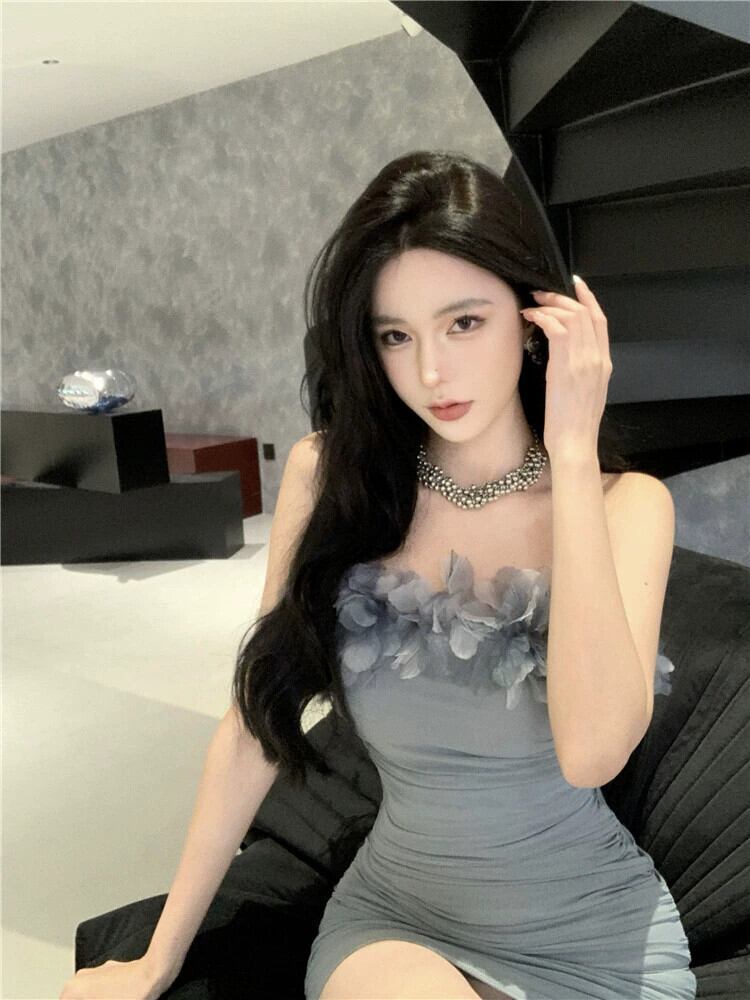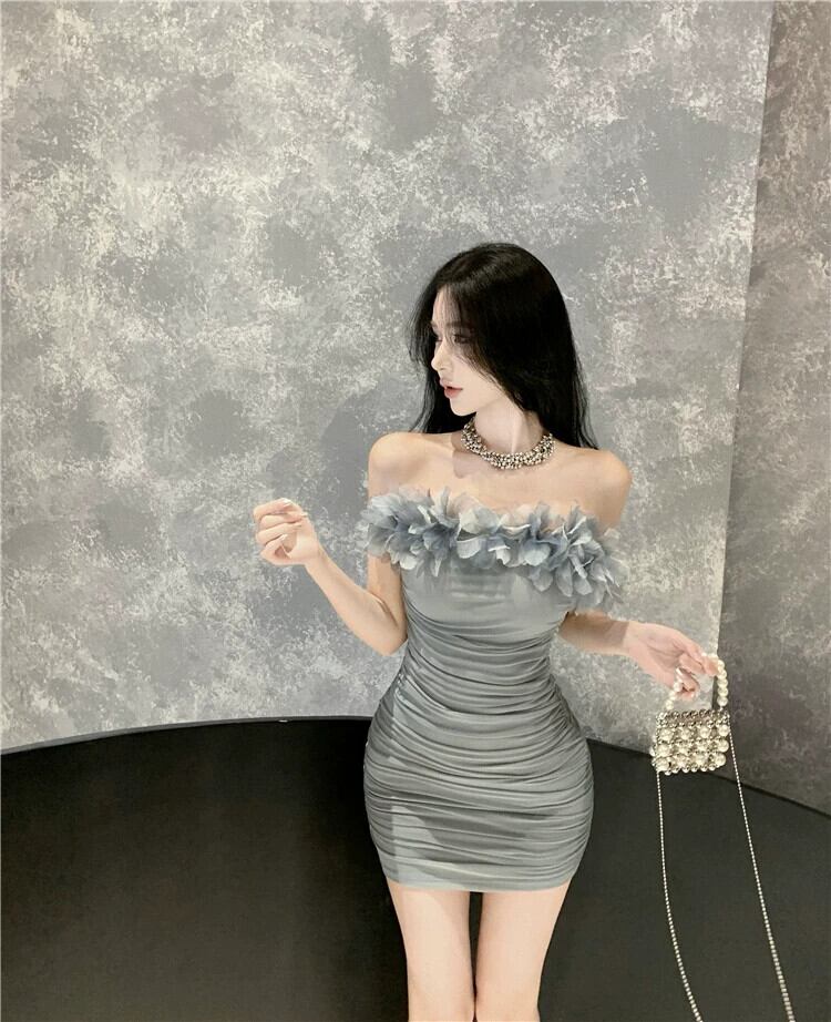 ライブ服女性アンカー pogenic ハイエンド純粋な欲望フレンチ立体フラワーセクシーなワンショルダーチューブトップドレス ピュア フラワーデザイン yeyij67607298988
