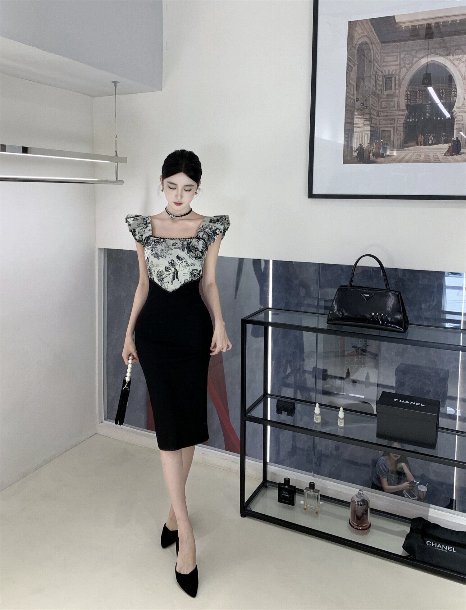 ヘップバーンスタイルのイブニングドレススカートフェミニニティライトラグジュアリーニッチハイエンドフレンチセクシーな小さなフライングスリーブ見事なスクエアカラードレス スクウェア yeyij26257405090