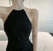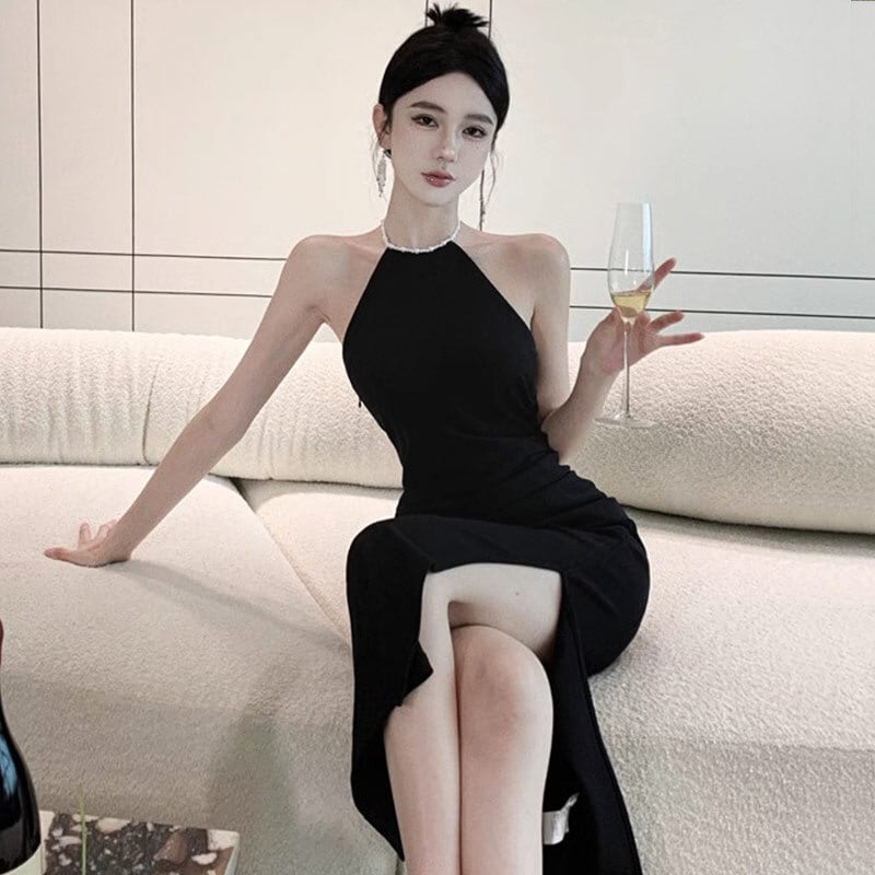 ヘップバーンスタイル黒のイブニングドレスロングスカート女性のハイエンドライト高級ニッチセレブ宴会気質セクシーなホルターネックドレス ブラック yeyij57906690702