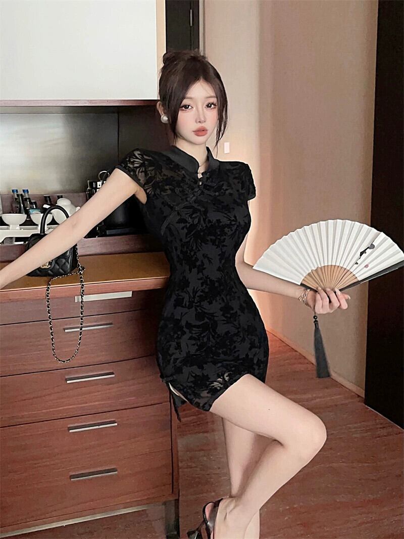 ライブ服女性アンカー服 pogenic 若いセクシーな黒メッシュ改良されたチャイナ ドレス ブラック yeyij56134842255