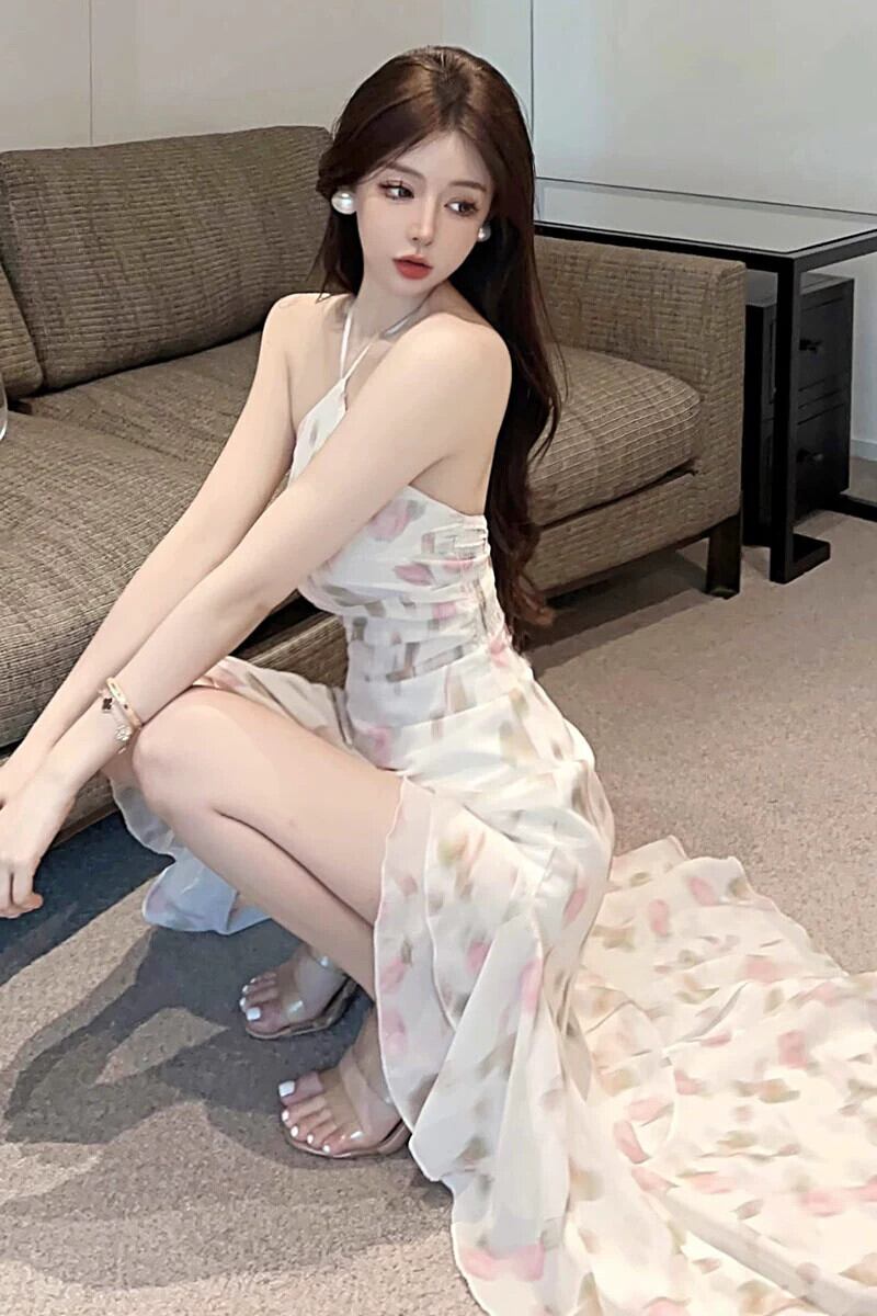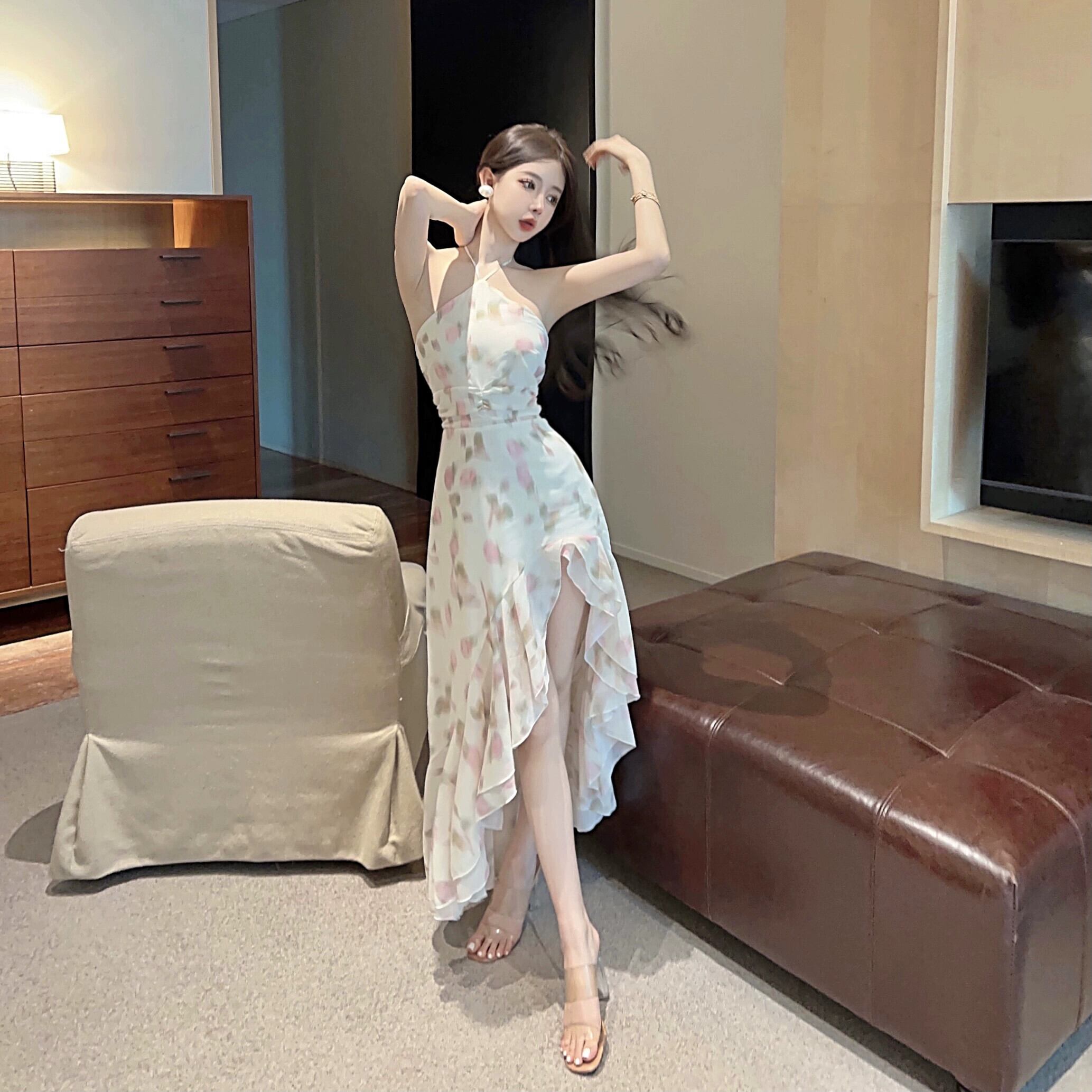 イブニングドレスロングスカート女性のハイエンドホリデーフレンチスーパーフェアリーセクシーな背中の開いたシフォンロングフィッシュテールホルターネックドレス yeyij57832761462