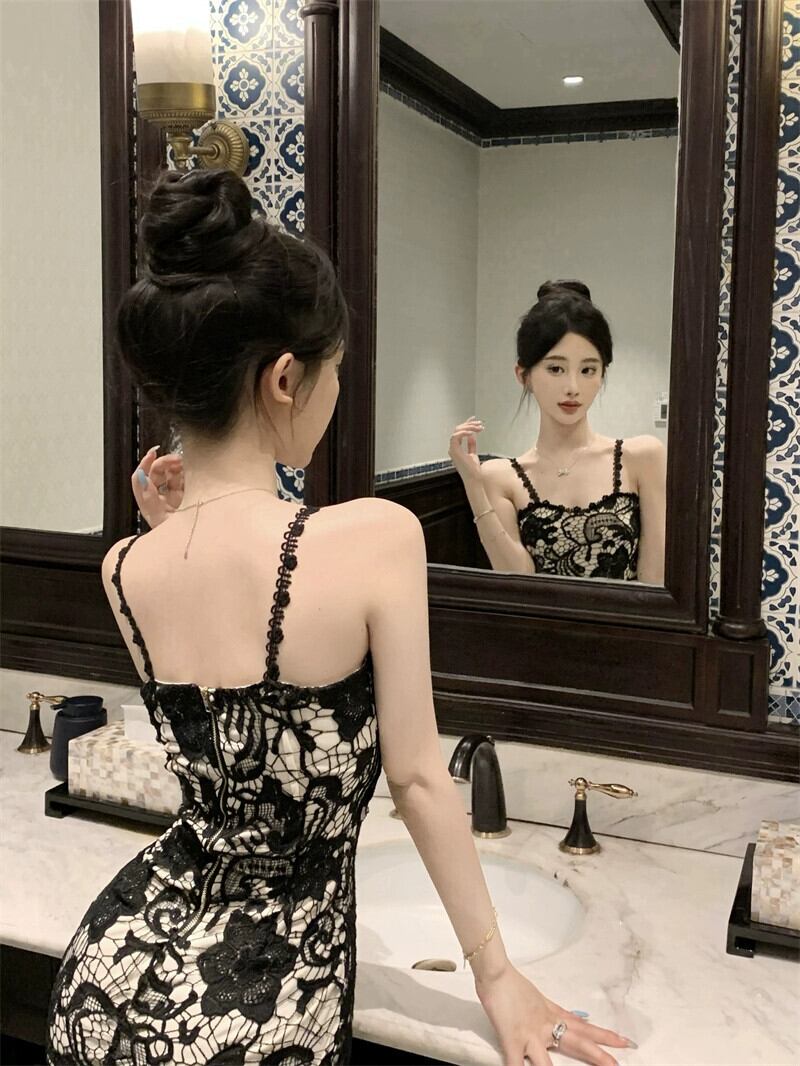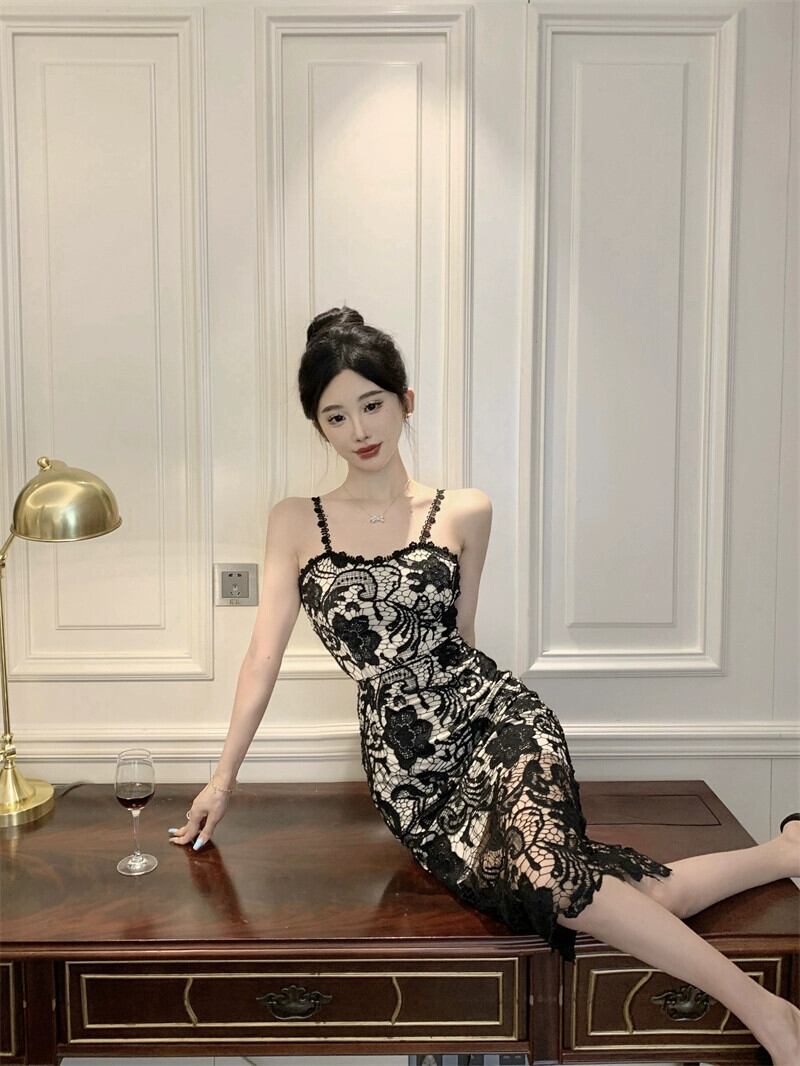 気質ドレス女神ファン高度な感覚セレブパーティーイブニングドレススリムセクシーなミッドレングスレースサスペンダードレス yeyij81384010570