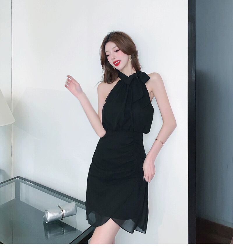 夏の婦人服 2023 新しい気質女神スタイルのハイエンドセンス黒シフォンセクシーなストラップレスホルターネックドレス ブラック サマー 夏物 yeyij8918079034
