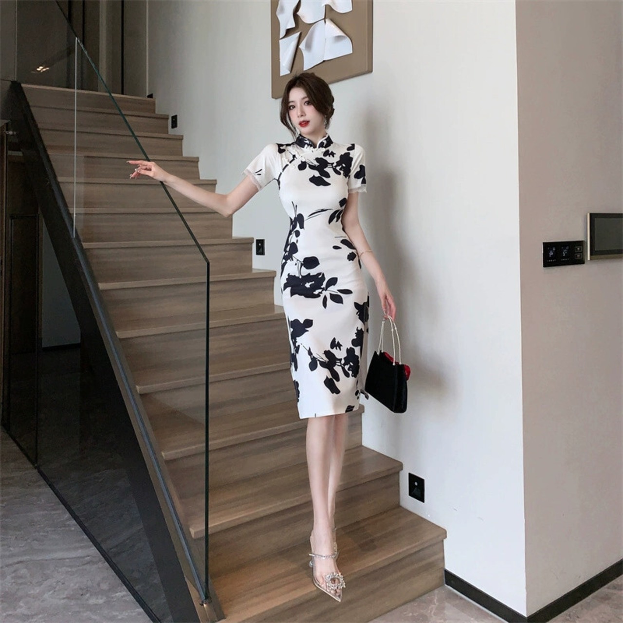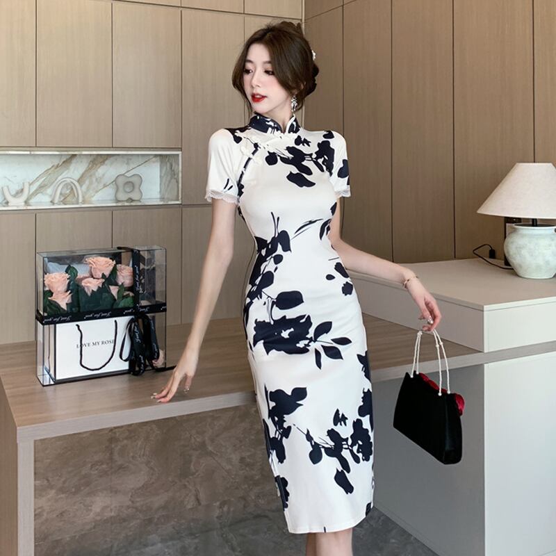 毎日の自己修養改善チャイナドレス若いスタイルプリント中華民国スタイルレトロバッグヒップハイスリットミドル丈ドレス yeyij67501211902