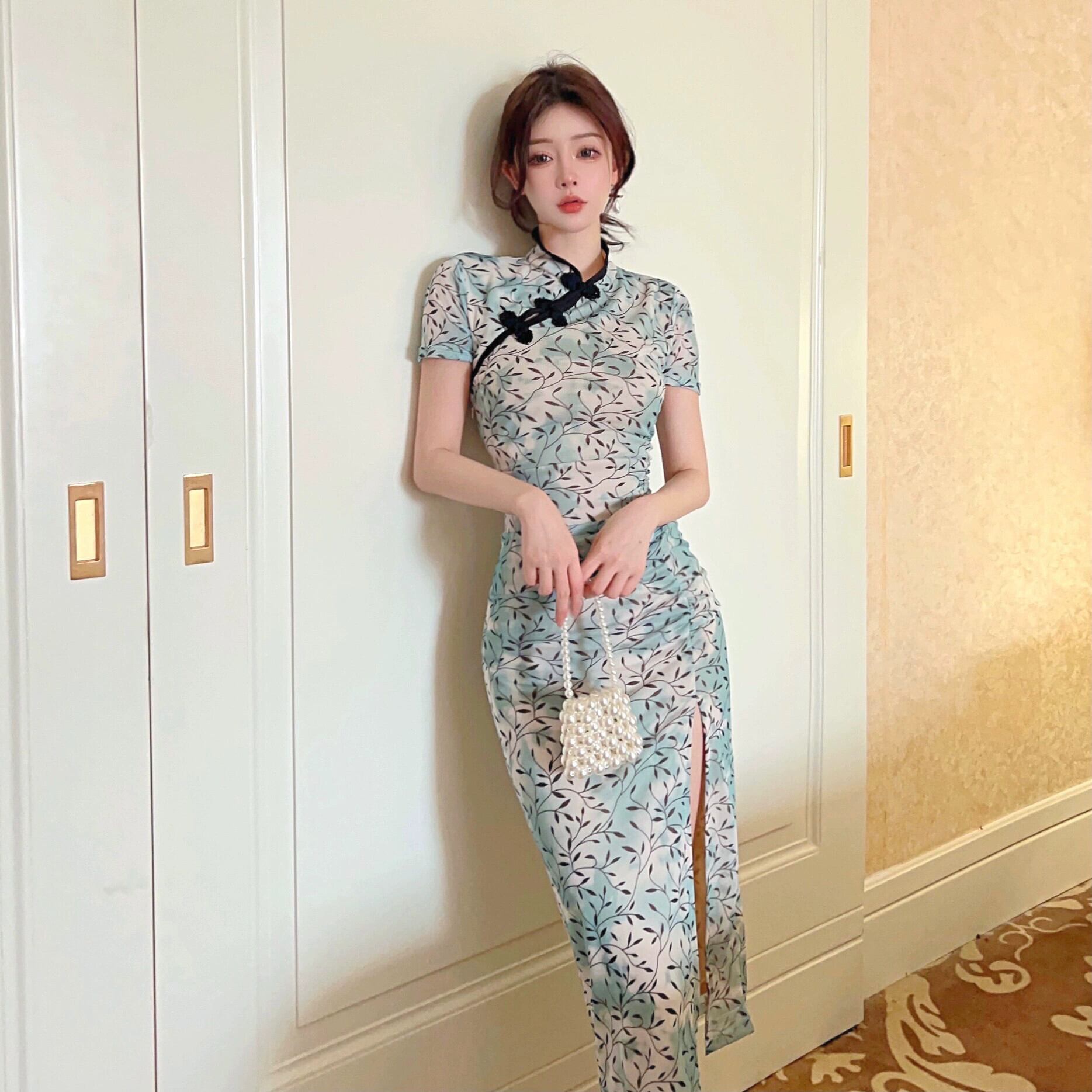 ライブ服女性アンカー服 pogenic 若いセクシーな花柄ミッドレングス改良されたチャイナ ドレス yeyij16747802126