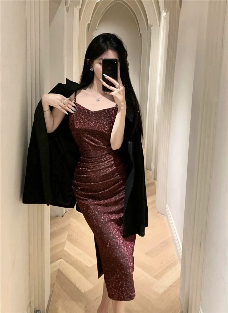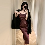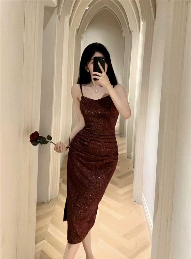 イブニングドレスハイエンドライトラグジュアリーニッチ女性年次総会ホストセクシーなミッドレングスのサスペンダードレス yeyij23704990987