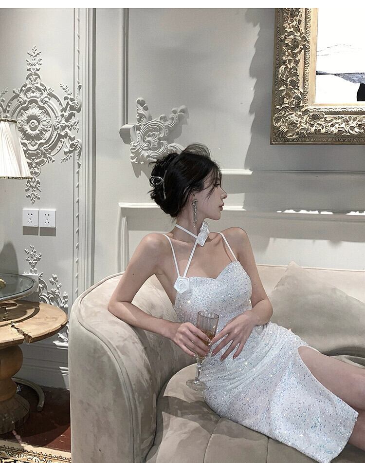 ホワイトスパンコールイブニングドレス女性 2023 新しいハイエンドライト高級ニッチハイエンド気質セクシーなサスペンダードレス yeyij42500602131