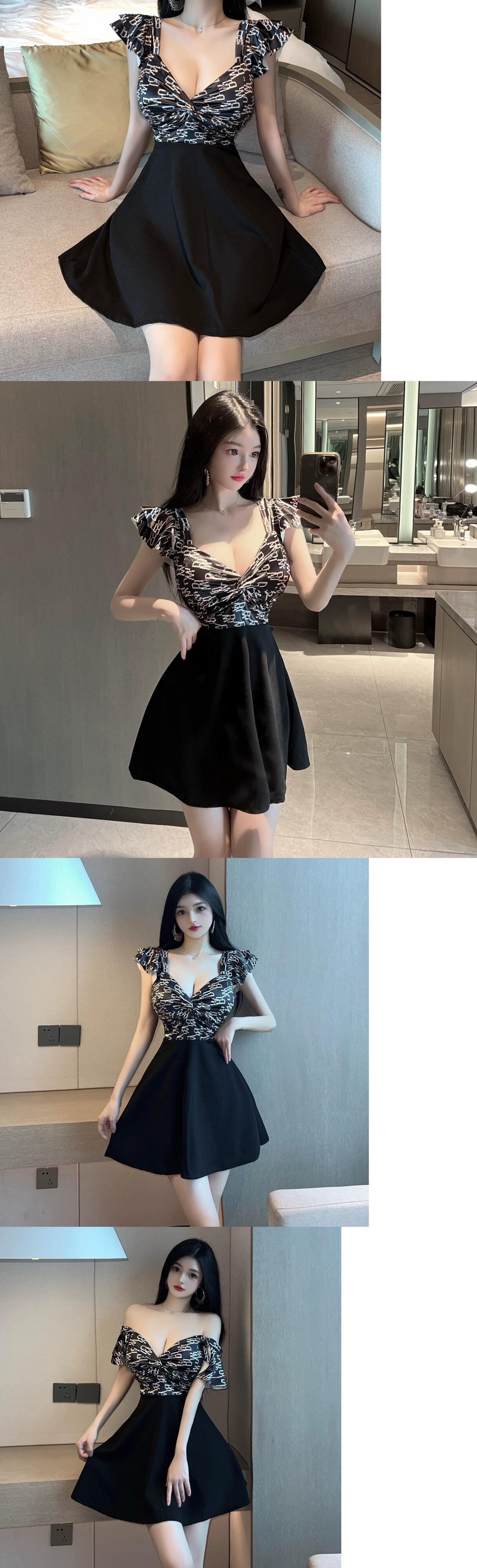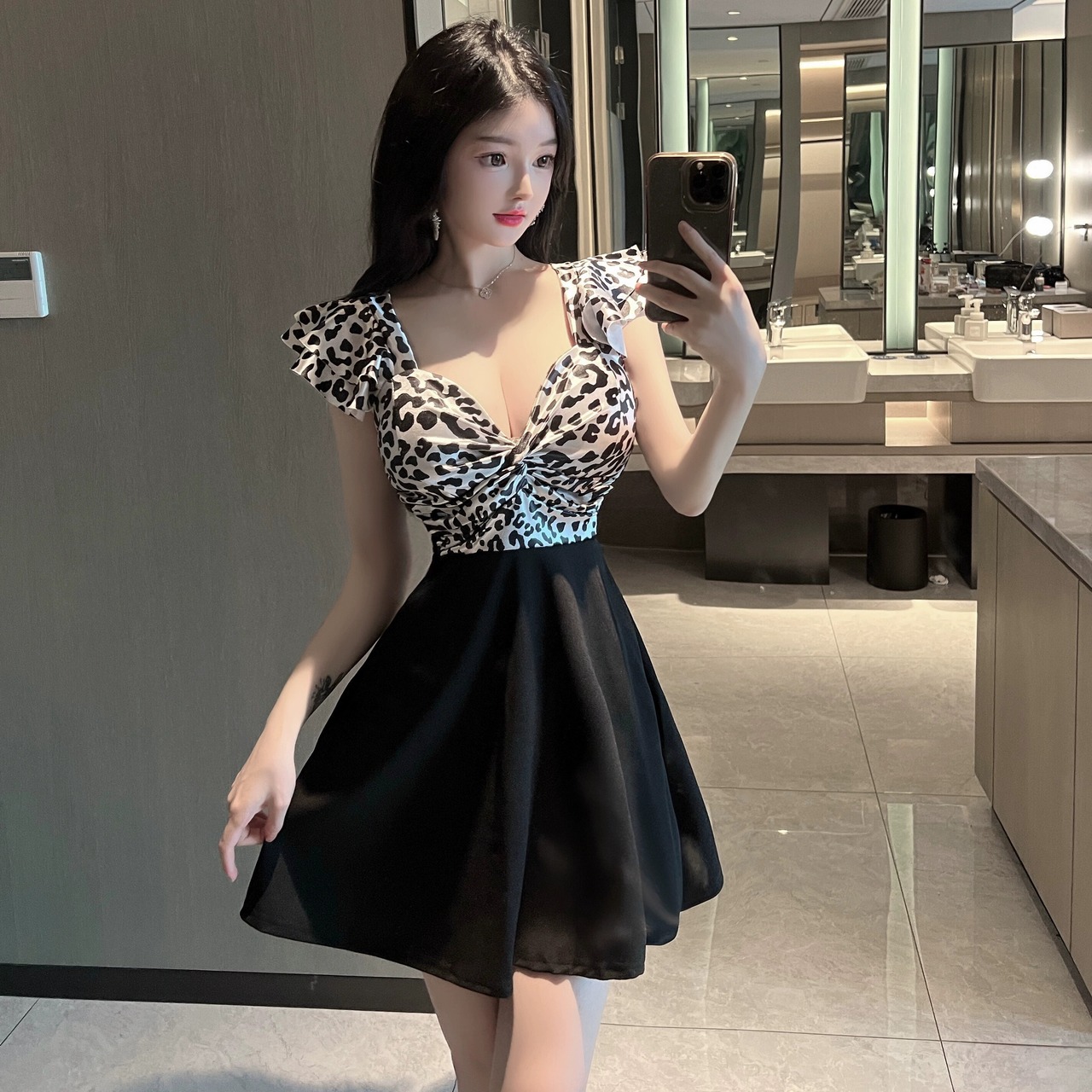 夜間作業オーバーオールペディキュア女性技術者の服セクシーな女性のローカット V ネックヒョウ柄小さなフライング スリーブ ドレス Vネック yeyij1352258340