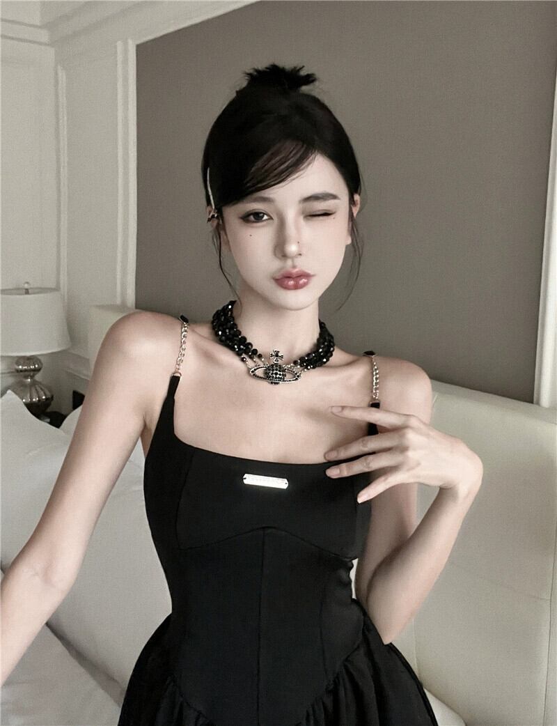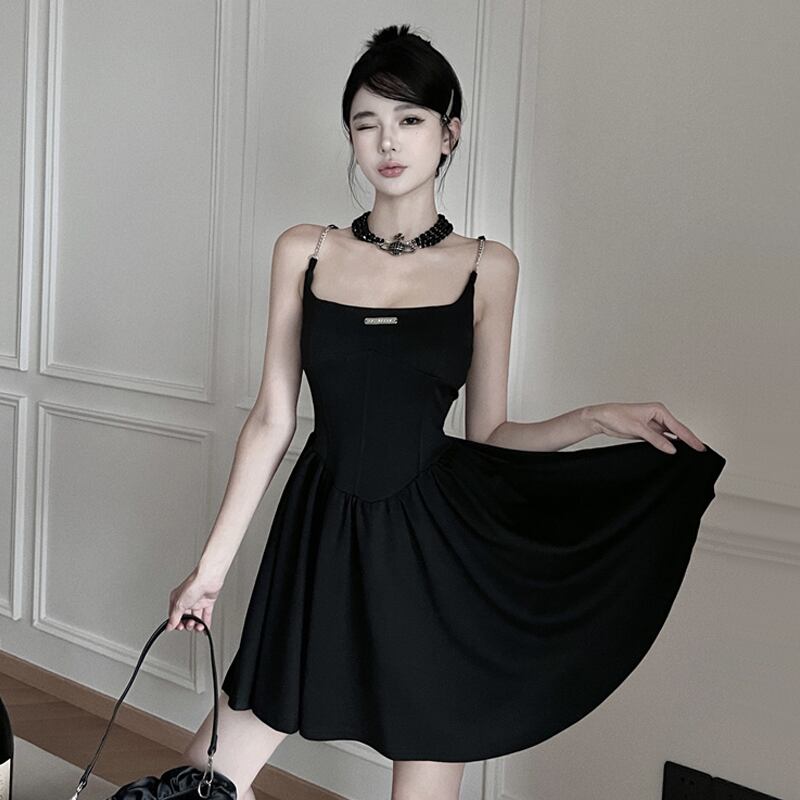 夏の婦人服 2023 新しいダークブラックリトルブラックドレスセクシーなスリムふわふわチェーンサスペンダードレス サマー 夏物 yeyij60493228460