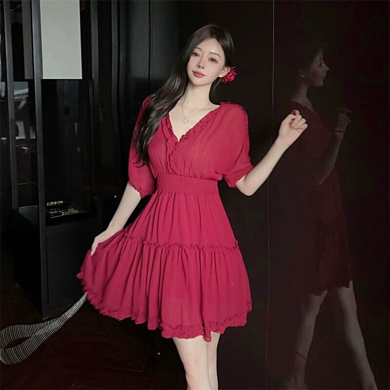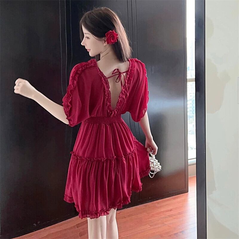 フランスの小さな赤いドレス夏の婦人服 2023 新しいシフォン純粋な欲望スタイルのセクシーな背中の開いたふわふわドレス レッド サマー 夏物 ピュア yeyij86982195958