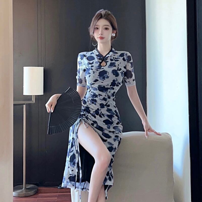 ライブ服女性アンカー服若いスタイルレトロ印刷日常気質ミッドレングス改良されたチャイナドレス yeyij25374803337