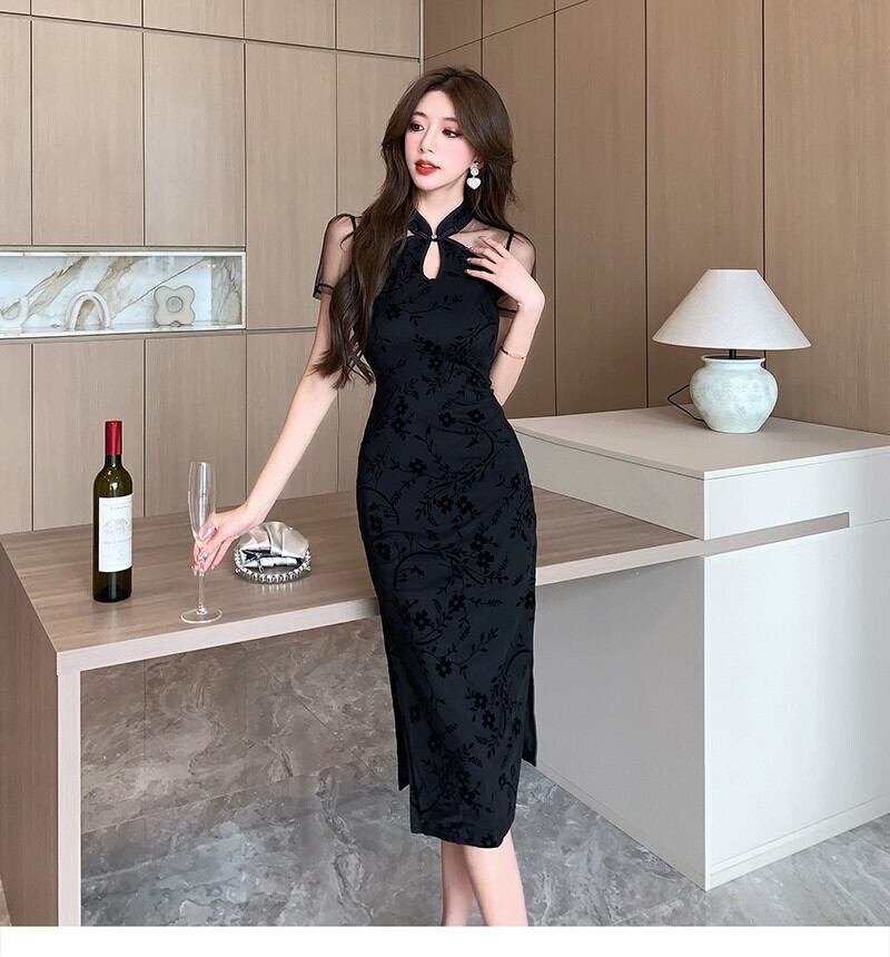 -スタイルのチャイナドレス、若いハイエンドの気質、美しく改良されたセクシーなメッシュステッチの黒のミドル丈のドレス ブラック yeyij62452816393