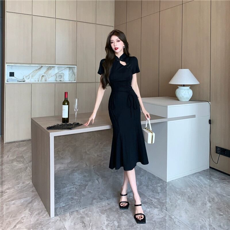 -スタイルチャイナドレス若いハイエンド気質中国風デイリーフィッシュテールスカート女性夏黒ミッドレングスドレス ブラック サマー 夏物 yeyij33467782194