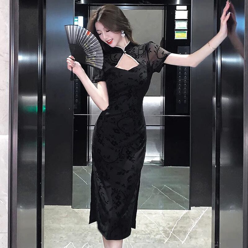 -スタイルのチャイナドレス若いハイエンドの気質改良版黒のセクシーなメッシュステッチ中空ミッドレングスドレス ブラック yeyij40243443619