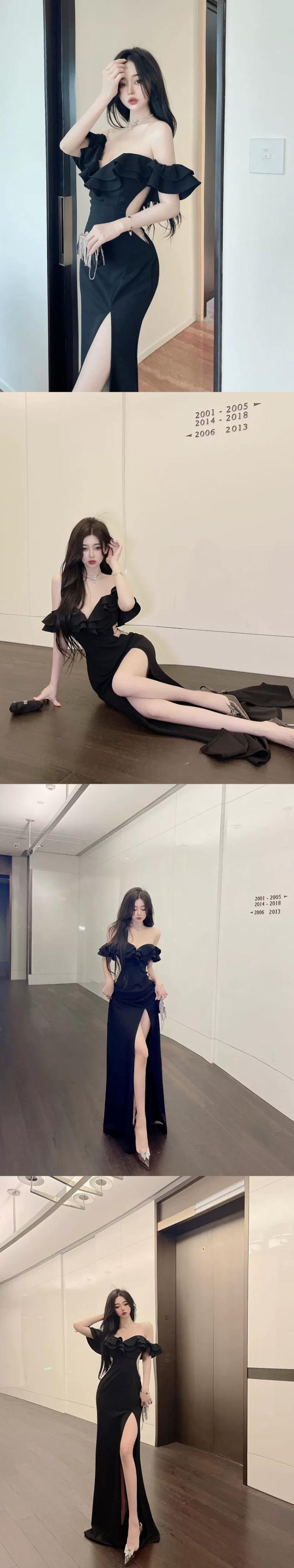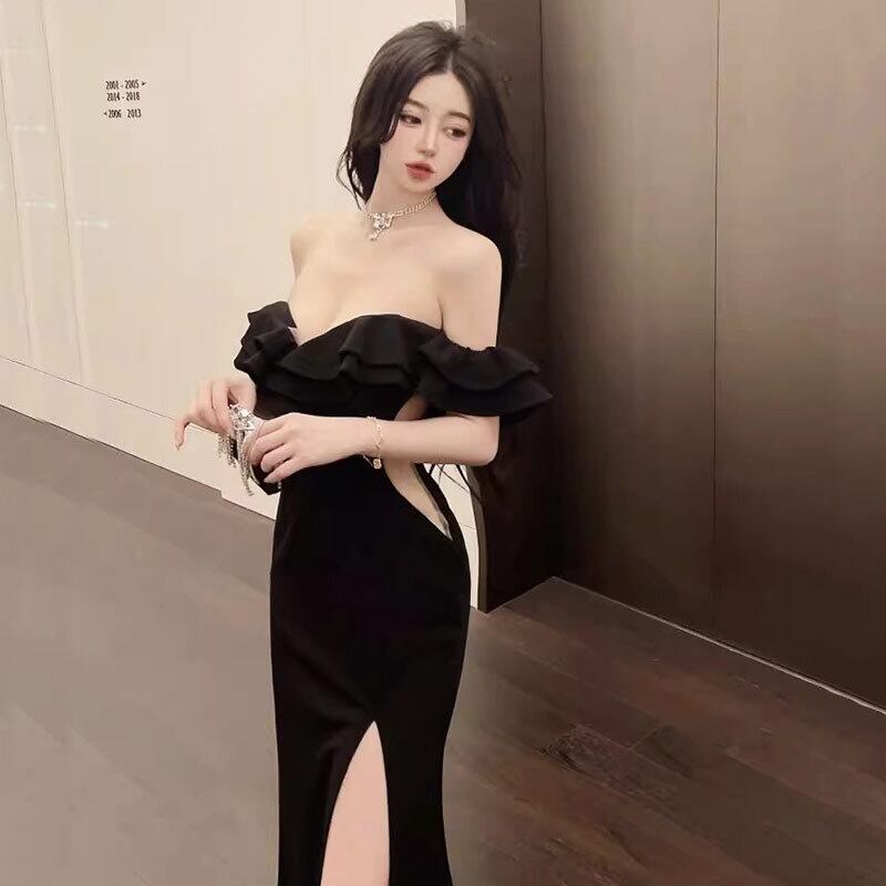 セクシーなワンショルダードレスロングスカート女性の夏のフリル気質チューブトップハイスリットイブニングドレススカートハイエンド感覚 サマー 夏物 yeyij88032114162