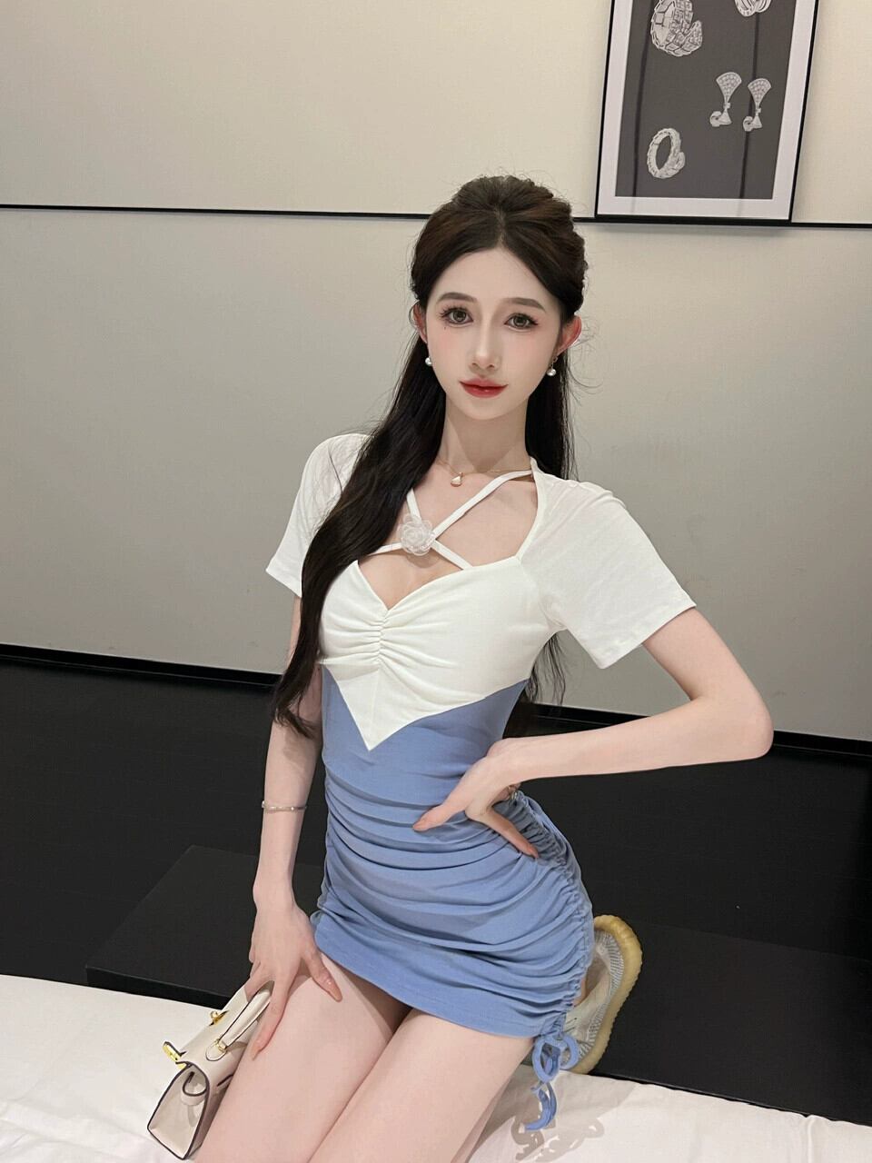 小さな夜の仕事作業服ショーフィギュアしわタイトドレス女性ヒットカラーローカットセクシーバッグヒップスカート yeyij62770290293