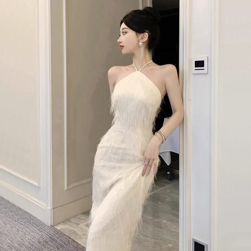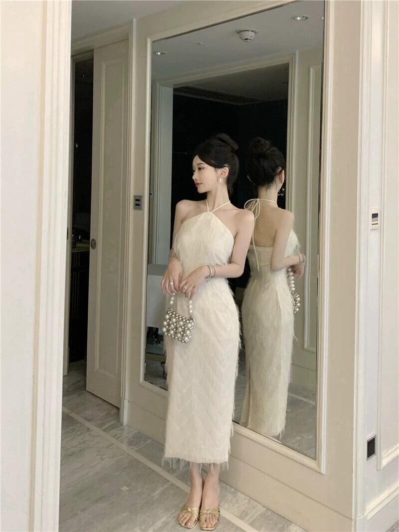 ホワイトイブニングドレスハイエンドライトラグジュアリーニッチハイエンドスーパーフェアリーテルセクシーなバックレスミッドレングスホルターネックドレス yeyij8223046440