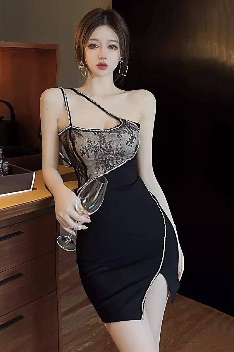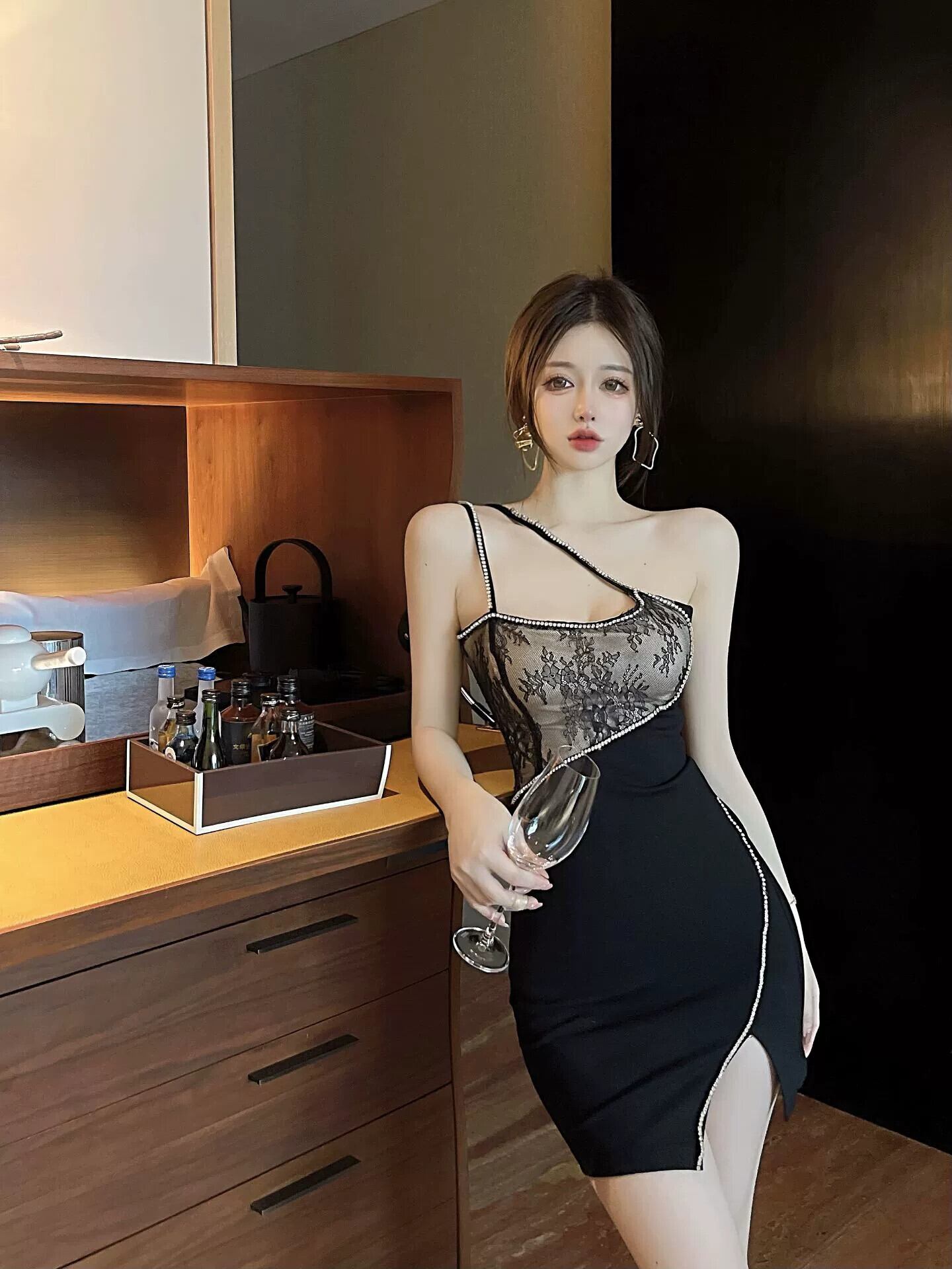 ナイトクラブの女性のバーナイトドレスハイエンド宴会気質セクシーなレースステッチサスペンダードレス yeyij34553973452