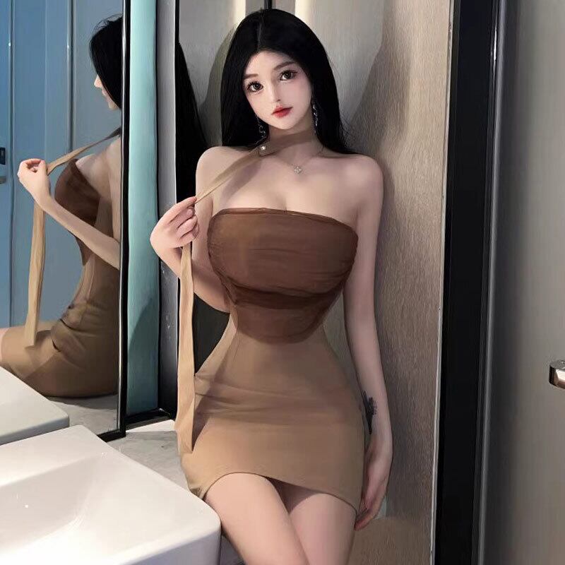 ナイトクラブ婦人服バー夜の作業服メッシュステッチ純粋な欲望セクシーなワンショルダーハンギングネックチューブトップドレス ピュア yeyij49857673873